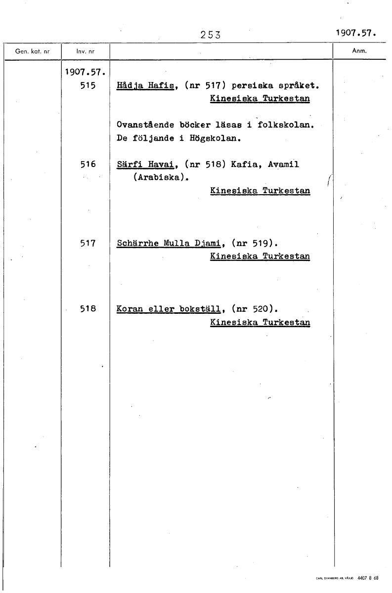 • 253 1907.57. 1907.57. 515 Hådja Hafis, (nr 517) persiska språket. Kinesiska Turkestan Ovanstående böcker läsas i folkskolan. De följande i Högskolan. 516 Särfi Havai, (nr 518) Kafia, Avamil (Arabiska)... Visa hela