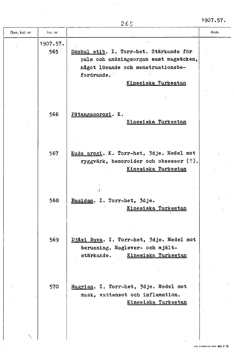• 1907.57. 265 1907.57. 565 Sänbul etib. I. Torr-het. Stärkande för puls och andningsorgan samt magsäcken, något lösande och menstruationsbe- fordrande. Kinesiska Turkestan 566 Pätanganorogi. K. Kinesis... Visa hela