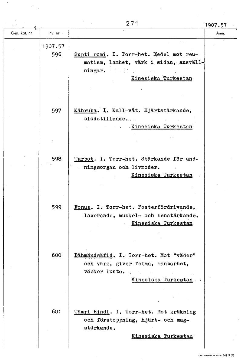 271 1907.57 1907.57 596 Supti roms. I. Torr-het. Medel mot rew- matism, lamhet, värk i sidan, ansväll- ningar. Kinesiska Turkestan 597 Kähruba. I. Kall-våt. Hjärtstärkande, blodstillande.. Kinesiska T...
