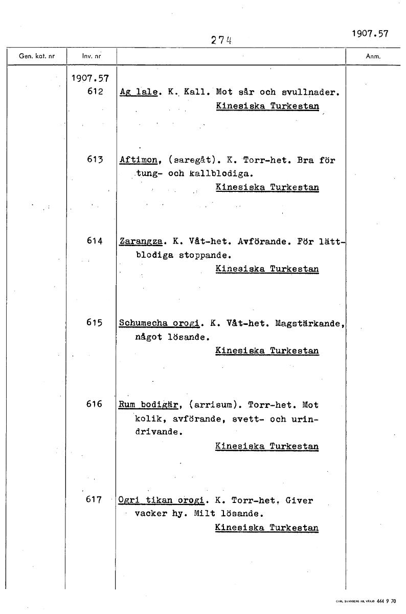 1907.57 274 1907.57 612 Ag lale. K. Kall. Mot sår och svullnader. Kinesiska Turkestan 613 Aftimon, (saregåt). K. Torr-het. Bra för tung- och kallblodiga. Kinesiska Turkestan 614 Zarangza. K. Våt-het. ...Visa hela