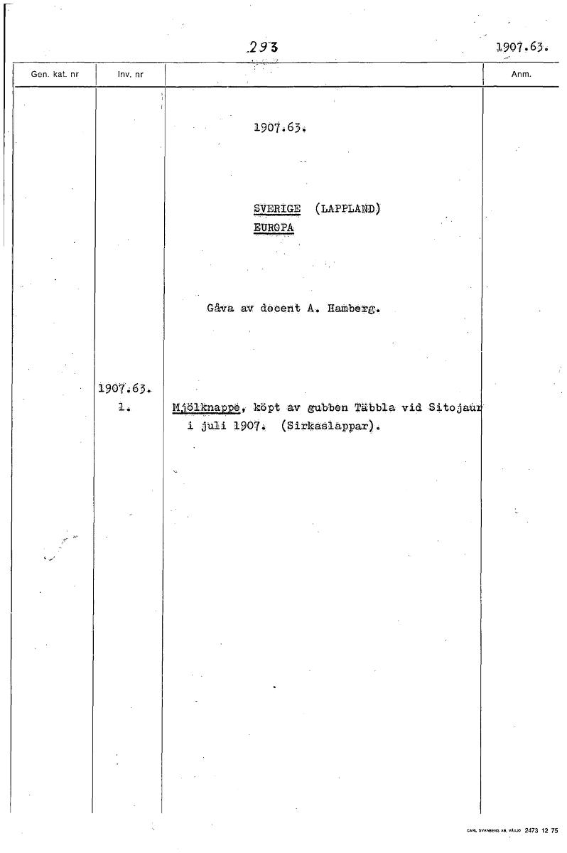 • .293 1907.63. 1907463 SVERIGE (LAPPLAND) EUROPA Gåva av döcent A. Reb•erE. 1907..63. 1. Mjölknane, köpt av gubben Ti vid Sitojau i juli 1907, (Sirkae1aPPar). [ocr]