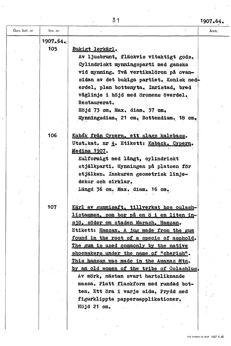 31 1907.64. 19074,64.; 105 Bukigt lerkärl. Av ljusbrunt, fläckvis vitaktigt gods. Cylindriskt Nynningsparti med ganska vid mynning. Två, vertikalöron på ovan- sidan av det bukiga partiet. Konisk ned erdel, plan bottenyta. Inristad, bred våglinje i höjd med öronens överdel. Restaurerat. Höjd 73 om. Max. diam. 37 cm, Mynningsdiam. 21 cm. Bottendian. 18 cm. 106 Kabåk från Cypern. ett slags kalebass. Utst.kat, nr A. Etikett: Kaback Cypern. Medina 1907. Kulformigt med långt, cylindriskt stjälkparti. Mynningen på platsen för stjälken. Inskuren geometrisk linje. dekor och cirklar. Längd 36 cm. Max. diam. 16 cm. 107 Kärl av gummisaft. tillverkat hos oulash- 34922322arplistammerå en ö i en liten in- sjö. söder om staden Marash. Hamzan. Etikett: Hamzan. A jug made from the gum found in the root of a s•ecie of as hold. The gmmis osed commonly by the native shoemakers_under the_ name of "cherishn. This hamzan was made in the Amanaz Mtn. by an old women of the tribe of Oolashlus Av mörk, nästan svart hartsliknande massa. Platt flaskform med rundad bot- ten. Ett öra i varje sida. Prydd med figurklippta pappersapplikationer. Höjd 21 cm. [ocr]