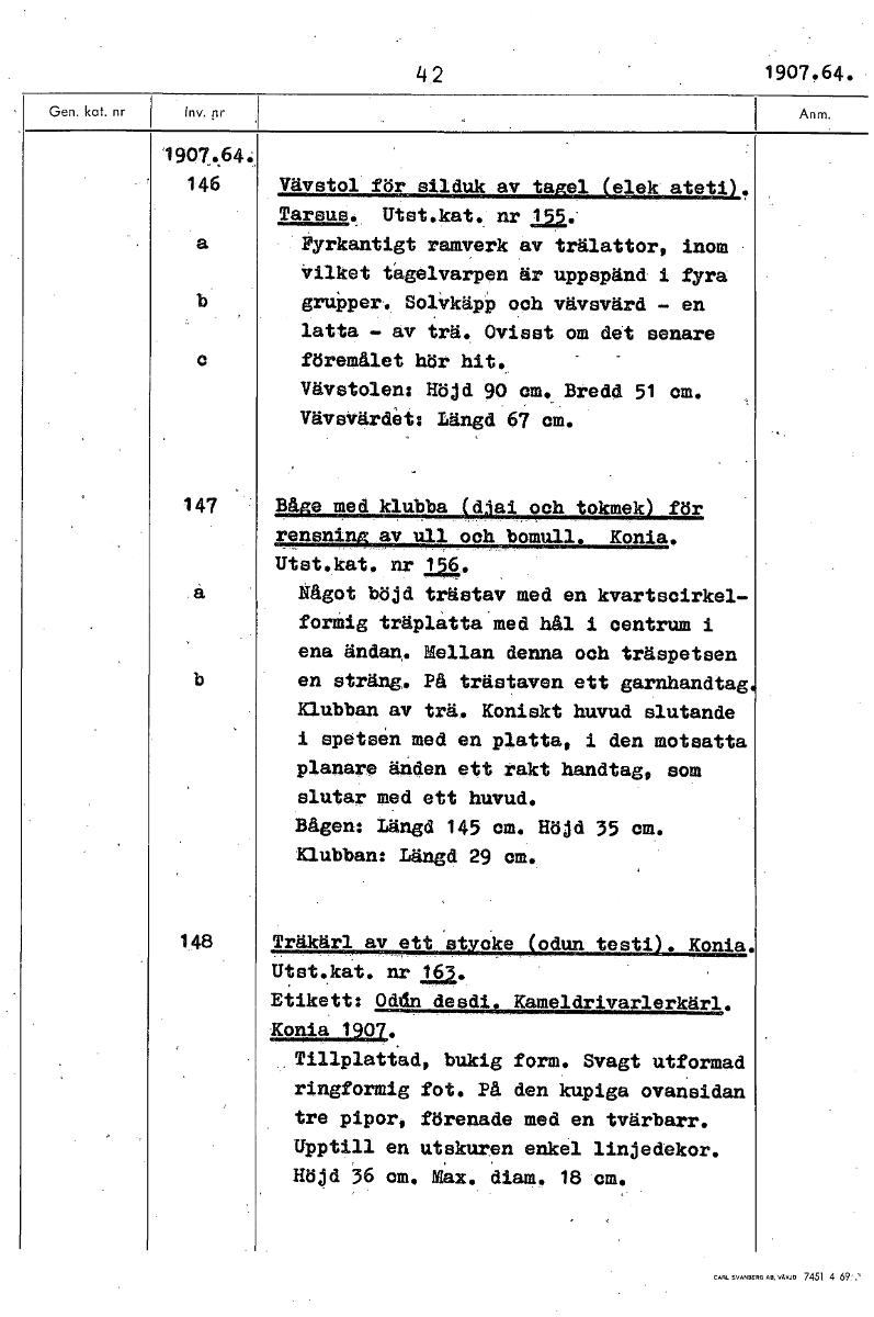 • 42 1907.64. 1907..64: 146 Vävstol för silduk av tagel (elek ateti). Tarsust Utst.kat. nr 15, a Fyrkantigt ramverk av trälattor, inom Vilket tågelvarpen är uppspänd i fyra grupper. SolVkäpP och vävsvär... Visa hela