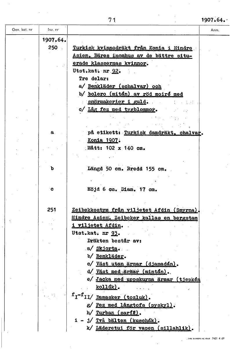 71 1907.64. 1907.64. 250 , Turkisk kvinnodräkt från Konia i Mindre Asien. Bäres inomhus av de bättre situ- erade klassernas kvinnor. Utst.katl Tre delar: a/ Benkläder (sohalvar) och b/ bolero (mitån).av röd moird med snörmakerier 1guld. 0/ Låg fez med tvgblommor• på etikett: Turkisk damdräkt halva . Konia 19071 .Mått: 102 x 140 cm. b Längd 50 cm. Bredd 155 cm. Höjd 6 om. piam. 17 cm. 251 Zeibekkostvet.frffivvilietet Afdin.(SmVrna) Mindre. Asien. Zeibeker kallas en bergstam i. viljetet Afdin. Utst.kati nr 22. . Dräkten består av: a/ SkJorta.: b/ Benkläder. e/ Väst utan ärmar (diamaddn). g/ Väst medärkar- (mintn). e/ Jacka med u i•skurna ärmar t e•kd kolldk). fII/ Damasker (tozluk). g/ Fez med långtofs (pyskyl). h/ Turban (sari). i - j/ Två bälten (kusohåk). k/ Läderetui för vapen (sillahlik). [ocr]Stäng