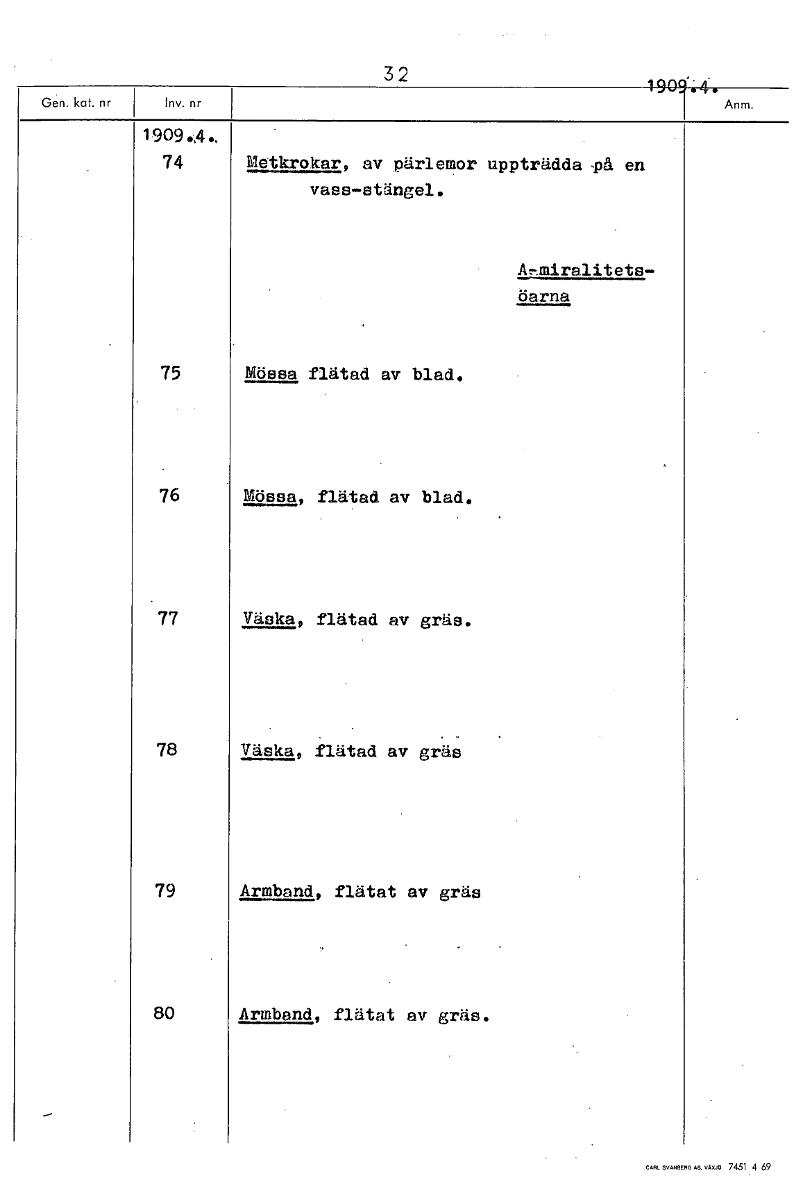 32 1909.4., 74 Metkrokar, av pärlemor uppträdda på en vass-stängel. Armiralitets- öarna 75 Mössa flätad av blad. 76 Mössa, flätad av blad. 77 Väska, flätad av gräs. 78 Väska, flätad av gräs 79 Armband...