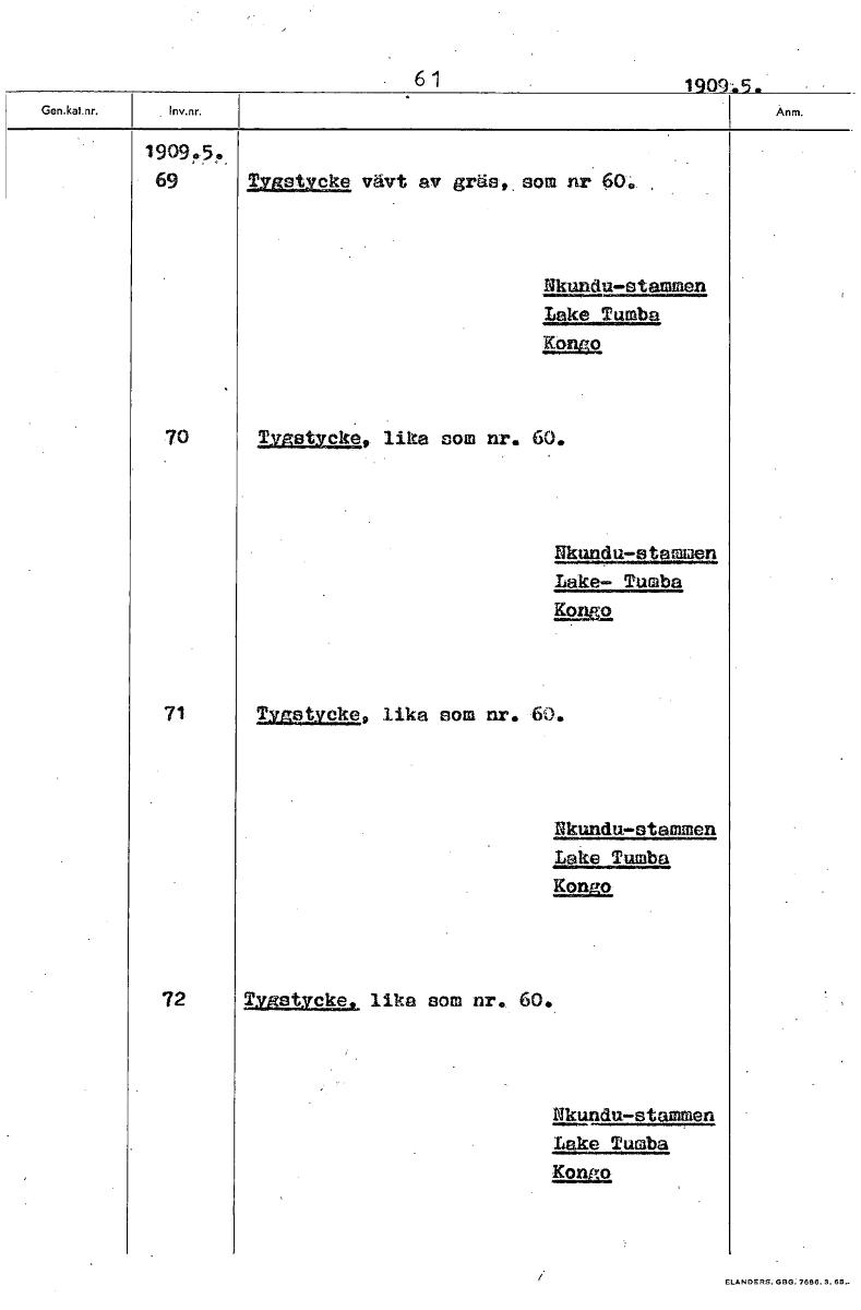 61 1909.5. 1909.5,, 69 ygstycke vävt av gräs, som nr 60.. Nkundu-stammen Lake Tumba Ume 70 TvRstycke, lika som nr. 60. Nhwihtetagam Lake- Tumba ..491.15.2 71 LyrapAyekelg, lika som nr. 60. Nkundu-stammen Lake Tumba Kono 72 Im:kuku lika som nr. 60. Nkundu-stammen Lake Tumba Korum) [ocr]