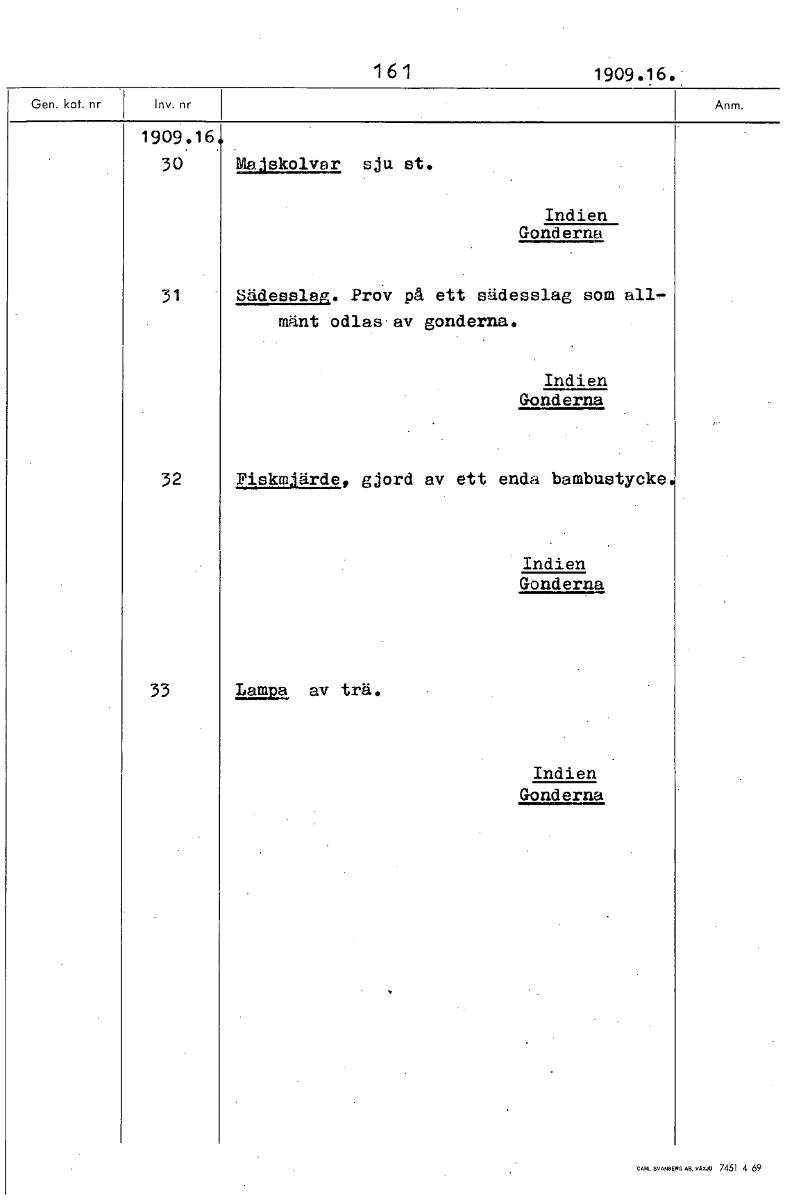 • 1 61 1909.16.: 1909.16 30 Viskolvar sju st. Indien Gonderna 31 Sädesslag. Prov på ett sädesslag som all, mänt odlas'av gonderna. Indien Gonderna 32 Fiskmjärde, gjord av ett enda bambustycke. Indien Go... Visa hela