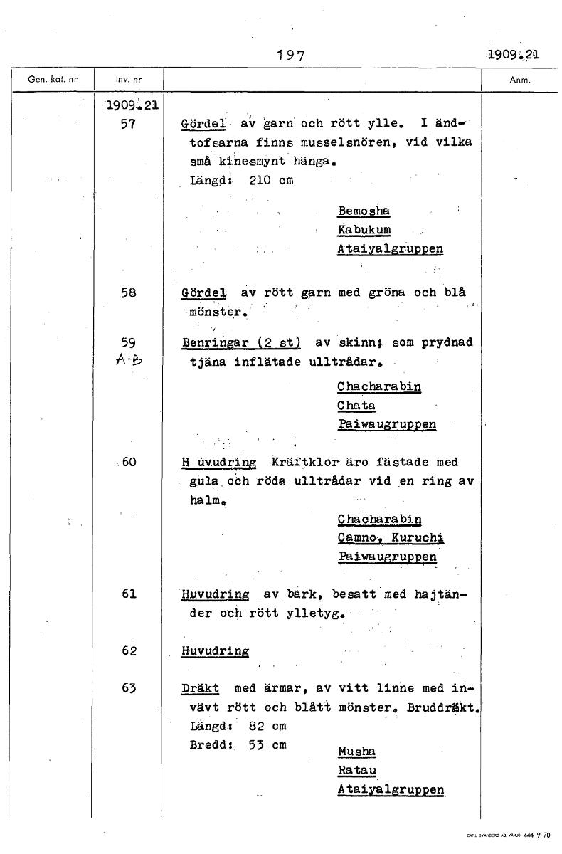 1 9 7 1909.4 1909 21 57 Gördel- av garn och rött ylle. I änd- tofsarna finns musselsnören, vid vilka små kinesmynt hänga. Längd: 210 cm Bemosha Kabukum Ataiyalgruppen 58 Gördel av rött garn med gröna och blå mönster.' 59 Alnringar (2 st) av skinn; som prydnad A -P, tjäna inflätade ulltrådar. Chacharabin Chata Paiwaugruppen 60 H uvudring Kräftklor äro fästade med gula och röda ulltrådar vid en ring av halm, Chacharabin Camno, Kuruchi Paiwaugruppen 61 Huvudring av bark, besatt med hajtän- der och rött ylletyg. 62 Huvudring 63 Dräkt med ärmar, av vitt linne med in- vävt rött och blått mönster. Bruddräkt. Längd:. 82 cm Bredd: 53 cm Musha Ratau Ataiyalgruppen [ocr]Stäng
