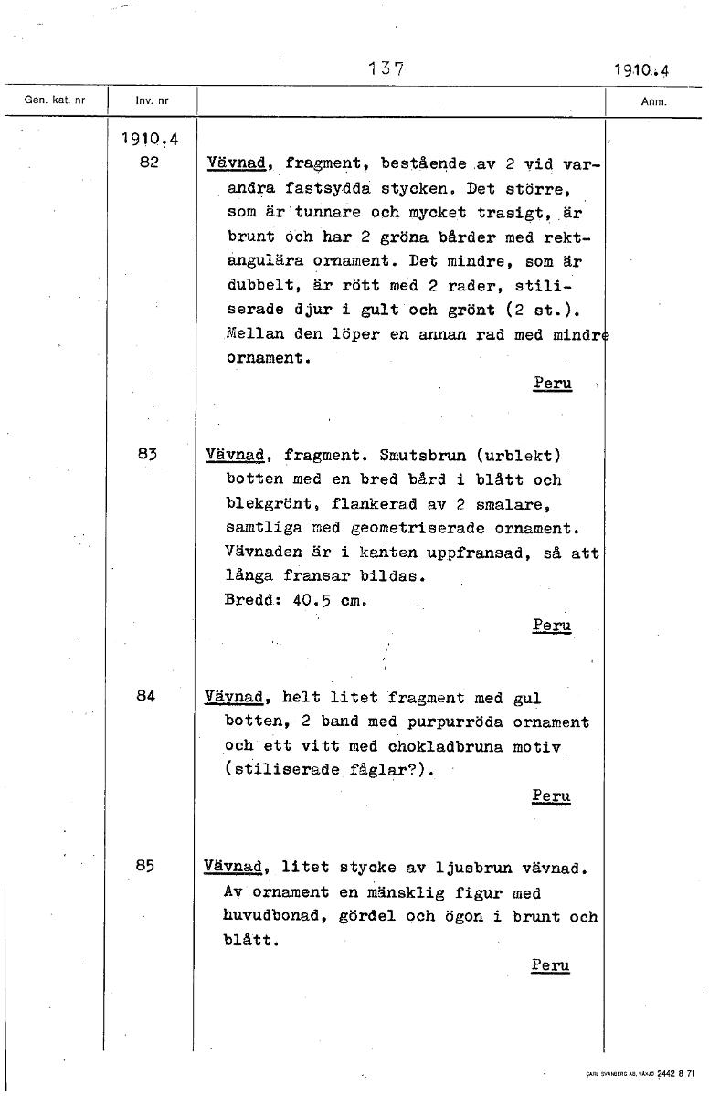 1 3 7 1910.4 1910.4 82 Vävnad, fragment, bestående av 2 vid var- andra fastsydda stycken. Det större, som är tunnare och mycket trasigt, är brunt och har 2 gröna bårder med rekt- angulära ornament. Det mindre, som är dubbelt, är rött med 2 rader, stili- serade djur i gult och grönt (2 st.). Mellan den löper en annan rad med mindr ornament. Peru 83 Vävnad, fragment. Smutsbrun (urblekt) botten med en bred bård i blått och blekgrönt, flankerad av 2 smalare, samtliga med geometriserade ornament. Vävnaden är i kanten uppfransad, så att långa fransar bildas. Bredd: 40.5 cm. Peru 84 Vävnad, helt litet fragment med gul botten, 2 band med purpurröda ornament och ett vitt med chokladbruna motiv (stiliserade fåglar?). Peru 85 Vävnad, litet stycke av ljusbrun vävnad. Av ornament en mänsklig figur med huvudbonad, gördel och ögon i brunt och blått. Peru [ocr]