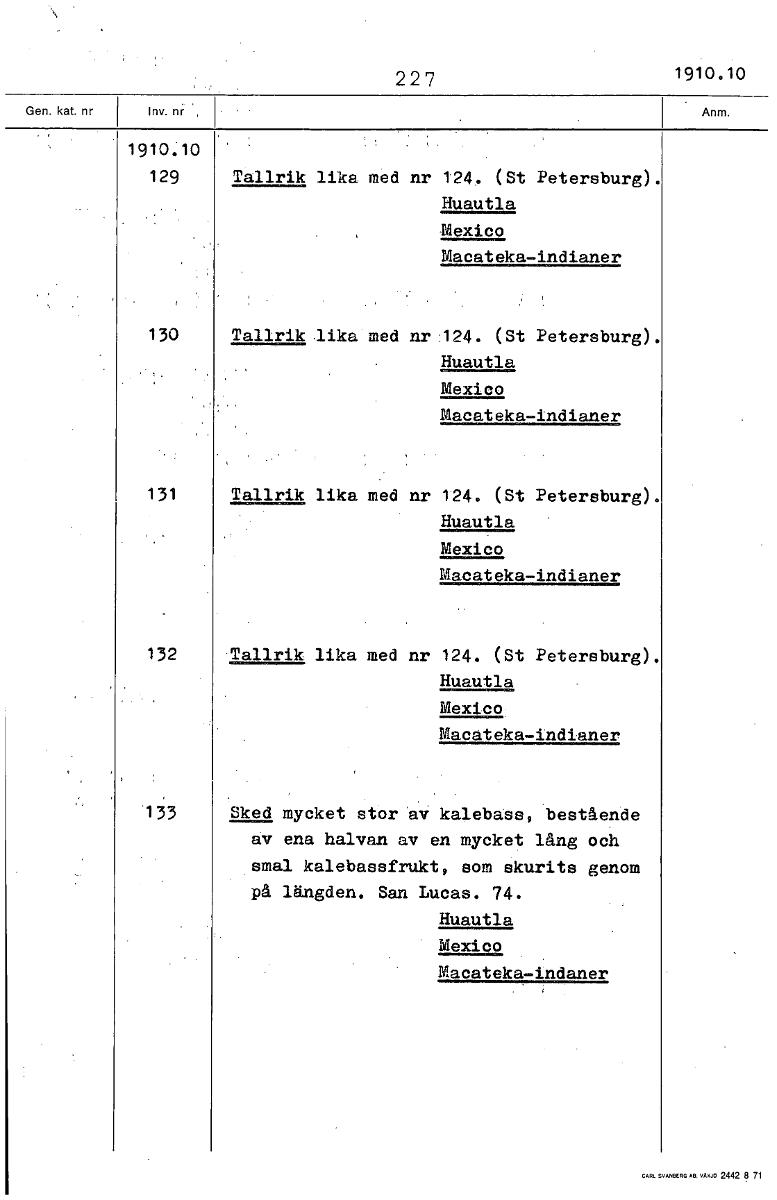 227 1910.10 1910.10 129 Tallrik lika med nr 124. (St Petersburg). Huautla -Mexico Macateka-indianer 130 Tallrik lika med nr:124. (St Petersburg). Huautla Mexico Macateka-indianer 131 Tallrik lika med nr 124. (St Petersburg). Huautla Mexico Macateka-indianer 132 Tallrik lika med nr 124. (St Petersburg). Huautla Mexico Macateka-indianer 133 Sked mycket stor av kalebass, bestående av ena halvan av en mycket lång och smal kalebassfruktp som skurits genom på längden. San Lucas. 74. Huautla Mexico Macateka-indaner [ocr]Stäng