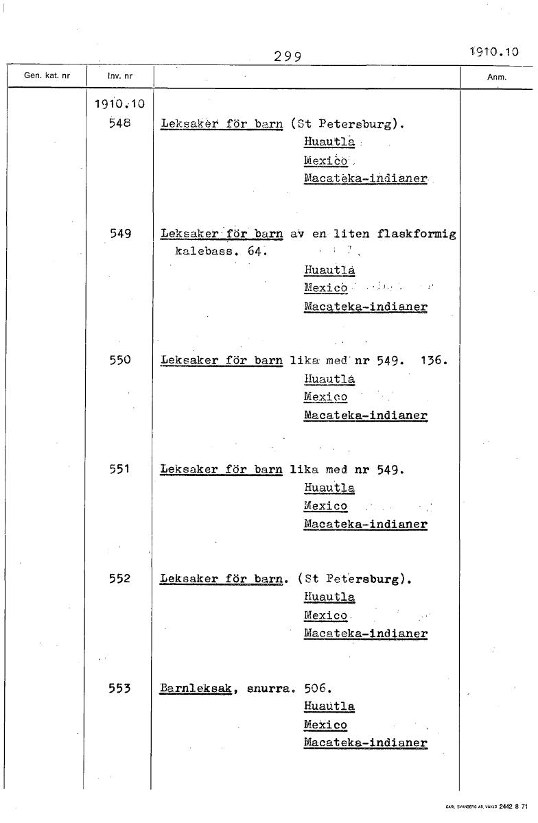 299 1910.10 548 Leksaker för barn (St Petersburg). Huautla, Mexi&Y, Macateka-indiane•. 549 Leksaker för barn av en liten flaskformig kalebass. 64. Huautla Mexico Macateka-indianer 550 Leksaker för bar...Visa hela