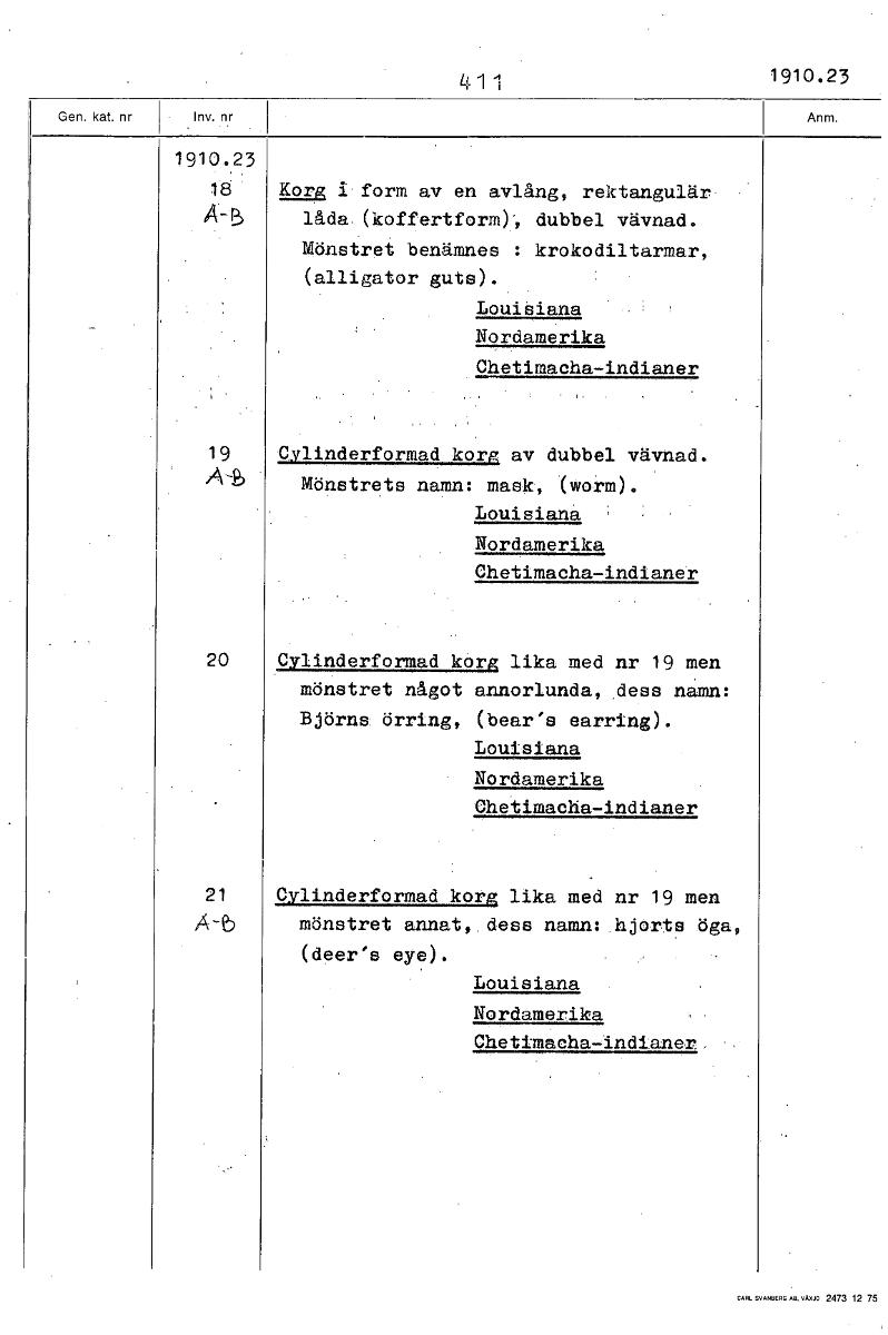 411 1910.23 1910.23 18 Korg i form av en avlång, rektangulär. låda.(koffertform):, dubbel vävnad. Mönstret benämnes : krokodiltarmar, (alligator guts). Louisiana Nordamerika Chetimacha-indianer 19 Cylinderformad korg av dubbel vävnad. Mönstrets namn: mask, (worm Louisiana Nordamerika Chetimacha-indianer 20 Cylinderformad korg lika med nr 19 men mönstret något annorlunda, dess namn: Björns. örring, (bear's earring). Louisiana Nordamerika Chetimacha-indianer 21 Cylinderformad korg lika med nr 19 men A-e) mönstret annat, dess namn: hjorts öga, (deer's eye). Louisiana Nordamerika Chetimacha-indianer. [ocr]