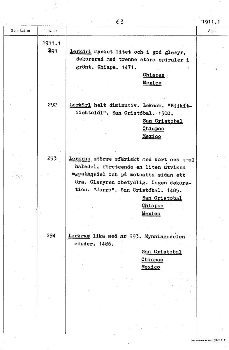 63 1911.1 • 1911.1 91 Lerkärl: mycktt 'litet och i god glasyr, dekorerad med trenne stora spiraler i grönt. Chiapa. 1471. Chiapas Mexico 292 Lerkärl helt diminutiv. Leksak. "Bilkft- ilehtold1", San Cristdbal.-1500. San Cristobal Chiapas Mexico 293 Lerkrus störze sfäriskt med kort och smal halsdel, företeende en liten utviken mYtiallgsdel och på motsatta sidan ett öra. Glasyren obetydlig. Ingen dekora- tion. Vorron. San Cristöbel. 1485. San Cristobal Chiapas Mexico 294 Lerkrus, lika med nr 293. Mynningedeleri sönder. 1486. San Cristobal Chiapas, Mexico [ocr]Stäng