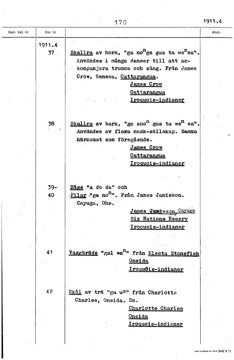 • 170 1911.4 1911..4 37 Skallra av horn, "ga nånga gus ta wensa". Användes i mänga danser till att ac- kompanjera trumma och sång. Från James Crow, Seneca, CattaranRua. James Crow Cattarangua Iroauois-i... Visa hela