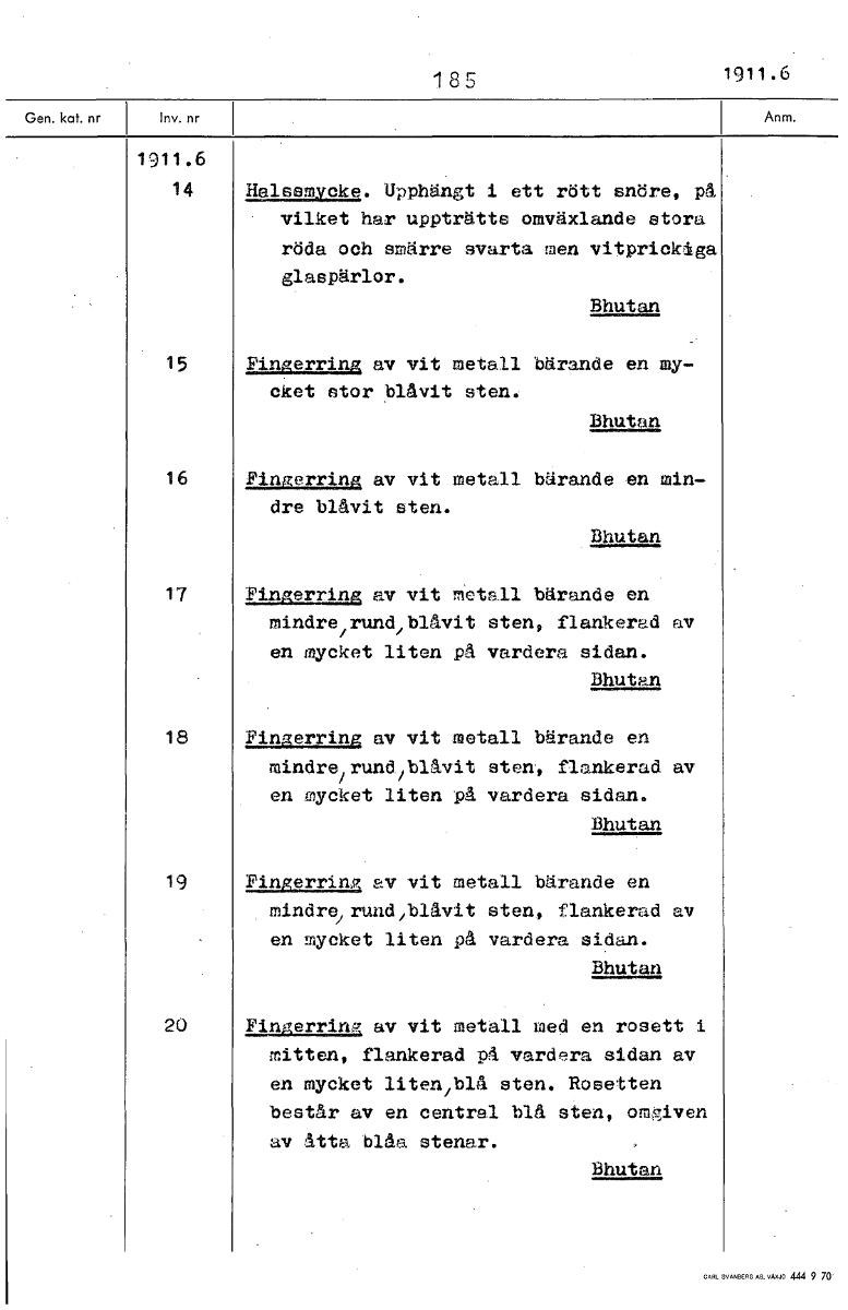 1 8 '5 1 91 1. 6 1911.6 14 Halssmycke. Upphängt i ett rött snöre, på vilket har uppträtts omväxlande stora röda och smärre svarta men vitprickiga glaspärlor. Bhutan 15 Fingerring av vit metall bärande...Visa hela