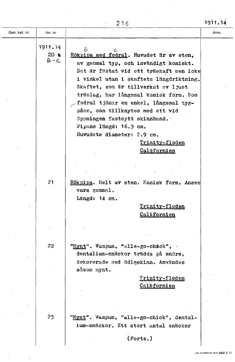 216 1911.14 1911.14 8 c 203 Rökpipa med fodral. Huvudet är av sten, 4-c.. av gammal typ, och invändigt koniskt. Det är fästat vid ett träskaft men icke i vinkel utan i skaftets längdriktning. Skaftet, som är tillverkat av ljust träslag, har långsmal konisk form. Som fodral tjänar en enkel, långsmal tyg- påse, som tillknytes med ett vid öppningen fastsytt skinnband. Pipans längd: 16.9 cm. Huvudets diameter: 2.9 cm. Trinity-floden Californien 21 Rökpipa. åelt av sten. Konisk form. Anses vara gammal. Längd: 14 cm. Trinitv-floden Californien 22 "Mynt". Wampum, "alle-go-chtbek", , dentalium-snäckor trädda på snöre, dekorerade med ödleskinn. Användes såsom mynt. 11112111=f121ta Californien 23 "Mynt". Wampum, "alle-go-chick", dental- ium-snäckor. Ett stort antal snäckor (Ports.) [ocr]