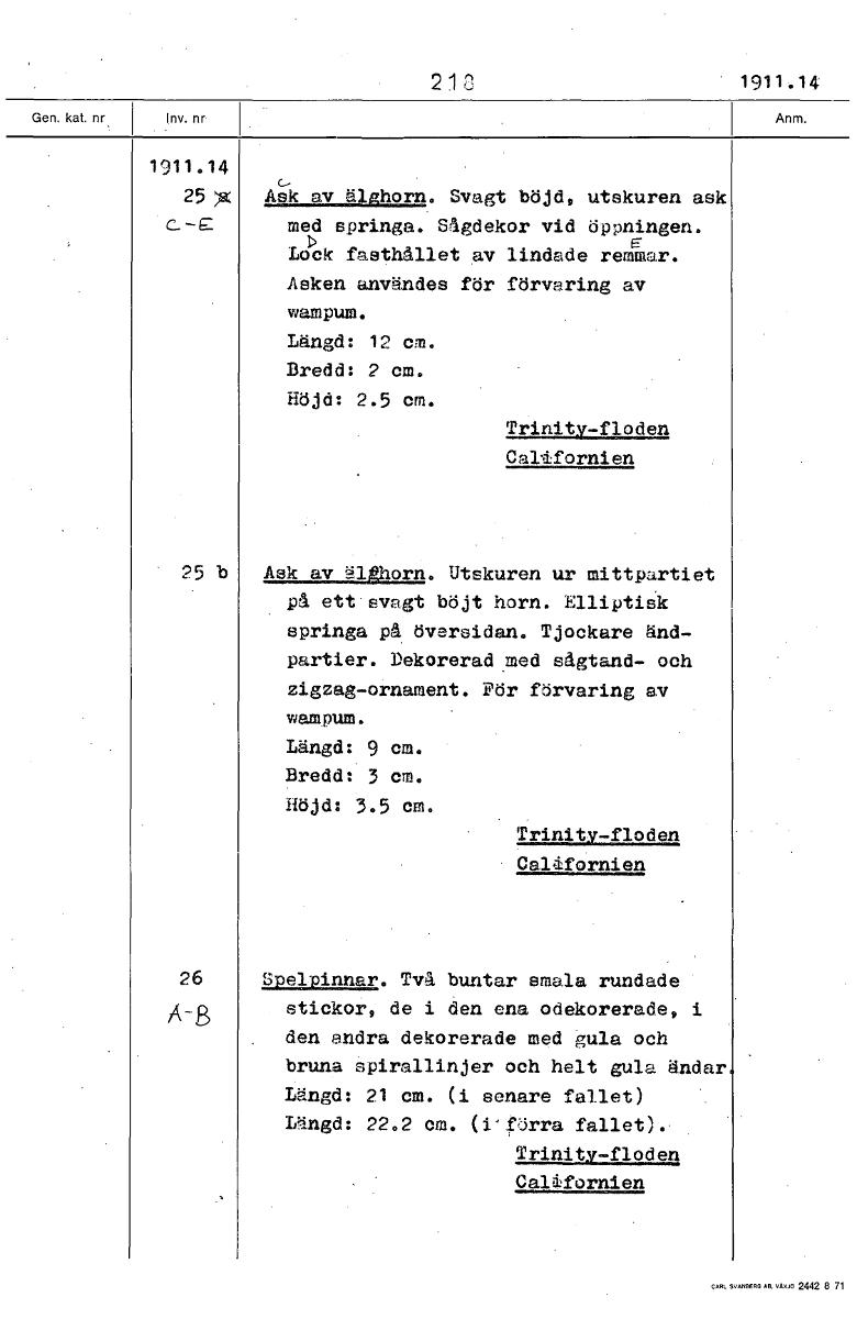 • 213 1911.14 1911.14 25 Ask av älghorn. Svagt böjd, utskuren ask med springa. Sågdekor vid öppningen. D Lock fasthållet av lindade remmar. Asken användes för förvaring av wampum. Längd: 12 cm. Bredd: 2... Visa hela