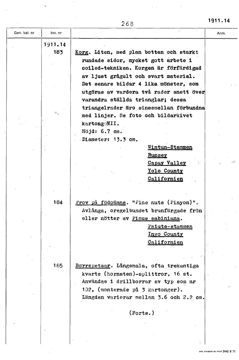 268 1911.14 1911.14 183 Korg. Liten, med plan botten och starkt rundade sidor, mycket gott arbete i coiled-tekniken. Korgen är förfärdigad av ljust grågult och svart material. Det senare bildar 4 lika mönster, som utgöras av vardera två rader snett öve varandra ställda trianglar; dessa triangelrader äro sina emellan. förbundn med linjer. Se foto och bildarkivet kartong-3MM Höjd: 6.7 cm. Diameter: 13.3 cm. Wintun-Stammen RumseY Ca.pay Valley Yolo County Californien 184 grov på födoämne. "Pina nuts (Pinyon)". Avlånga, oregelbundet brunfärgade frön eller nötter av l'inue sabiniana. i'aiute-stammen inyo County Californien 165 Borrspetsar. Långsmala, ofta trekantiga kvarts (hornsten)-splittror, 16 st. Användas i drillborrar av typ som nr 102, (monterade på 3 kartonger). Längden varierar mellan 3.6 och 2.2 em. (Ports.) [ocr]