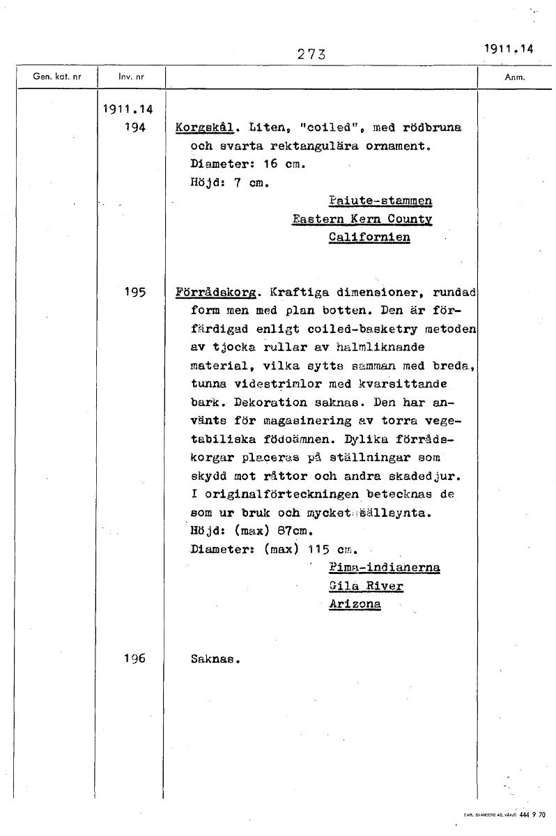 273 1911.14 1911.14 194 Korgskål. Liten, "coiled", med rödbruna och svarta rektangulära ornament. Diameter: 16 cm. Höjd: 7 cm. Ijaiute-stammen Eastern Kern County Californien • 195 Förrådskorg. Krafti...Visa hela