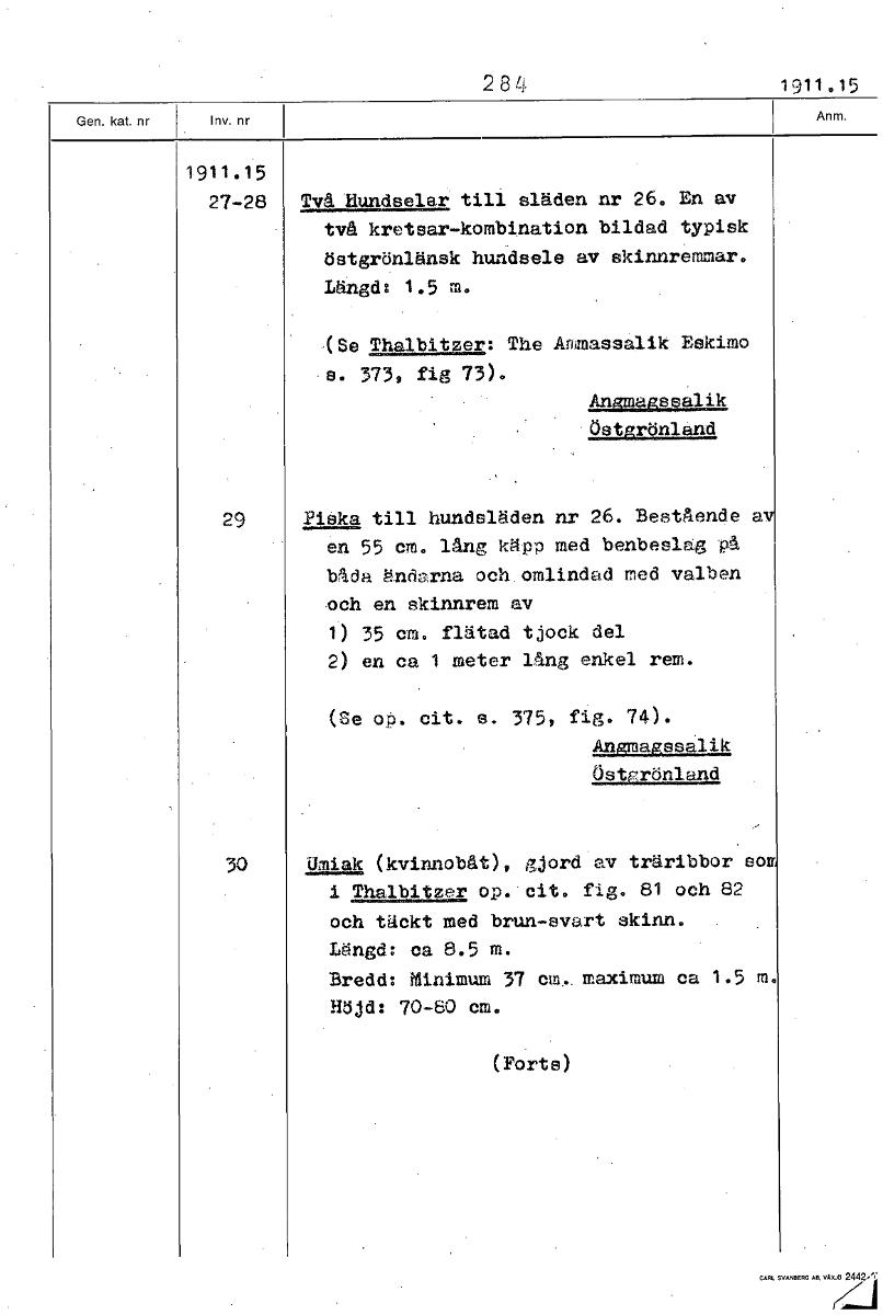 • 284 1911 15 1911.15 27-28 Två Hundselar till släden nr 26. En av två kretsar-kombination bildad typisk östgrönlänsk hundsele av skinnremmar. Längd: 1.5 m. (Se Thalbitzer: The Annassalik Eekimo 8. 373,... Visa hela