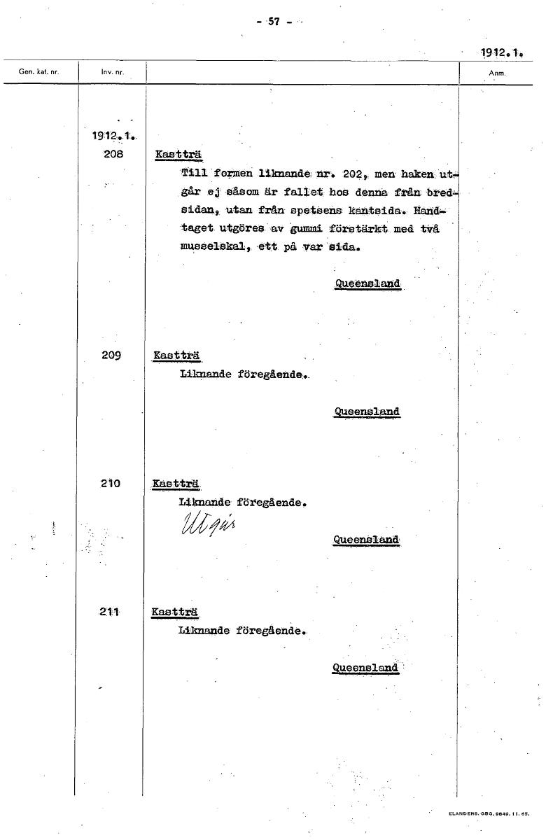 - 57 1912.1, 1912.1. 208 Kastträ Till formen liknande- nr. 202,, men haken:ut' • går ej såsom är fallet hos denna från bred' sidan, utan från spetåens kantsida. Hand- taget utgöres av gummi förstä.rkt med tirå • musselskal, -ett på var sida. • Queensland 09 Kastträ Liknande föregående. • Queensland 210 Kastträ Liknande föregående. • Queensland 211 Kastträ Liknande föregående. Queensland [ocr]