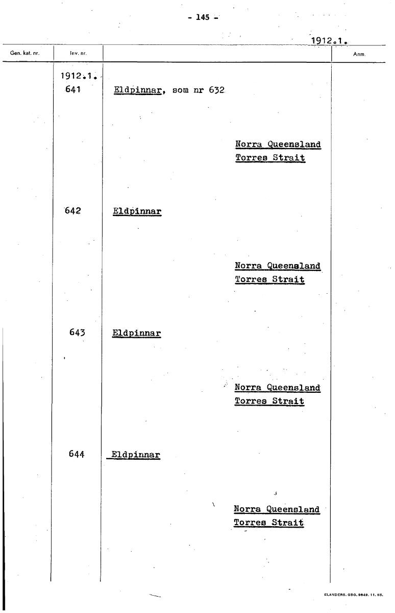 • - 145 - 1912.1. , 641 Eldpinnar, som nr 632. Norra. Queensland Torres Strait .42 Eldpinnar Norra Queensland Torres Strait 643 Eldpinnar Norra Queensland. Torres Strait 644 Eldpinnar Norra Queensland. ... Visa hela
