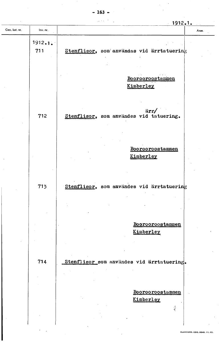 • - 163 - 191 2 .1 . 1912..h • 711 Stenflisor, som användas vid ärrtatuerin‘s Boorooroostammen Kimberley ärr/ 712 Stenflisor, som användes vid tatuering. Boorooroostammen Kimberley 713 Stenflisor, som a... Visa hela