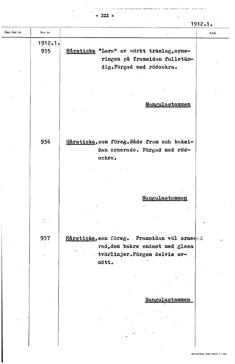 • -- 222 1912.1 1912.1. 935 Håret loka "Lara" av mörkt träslag, orne på framsidan fullstän- dig.Färgad med rödockra. Mangulastammen 936 Hårsticka,som föreg.Både fram och baksi- dan Ornerade. Färgad med ... Visa hela