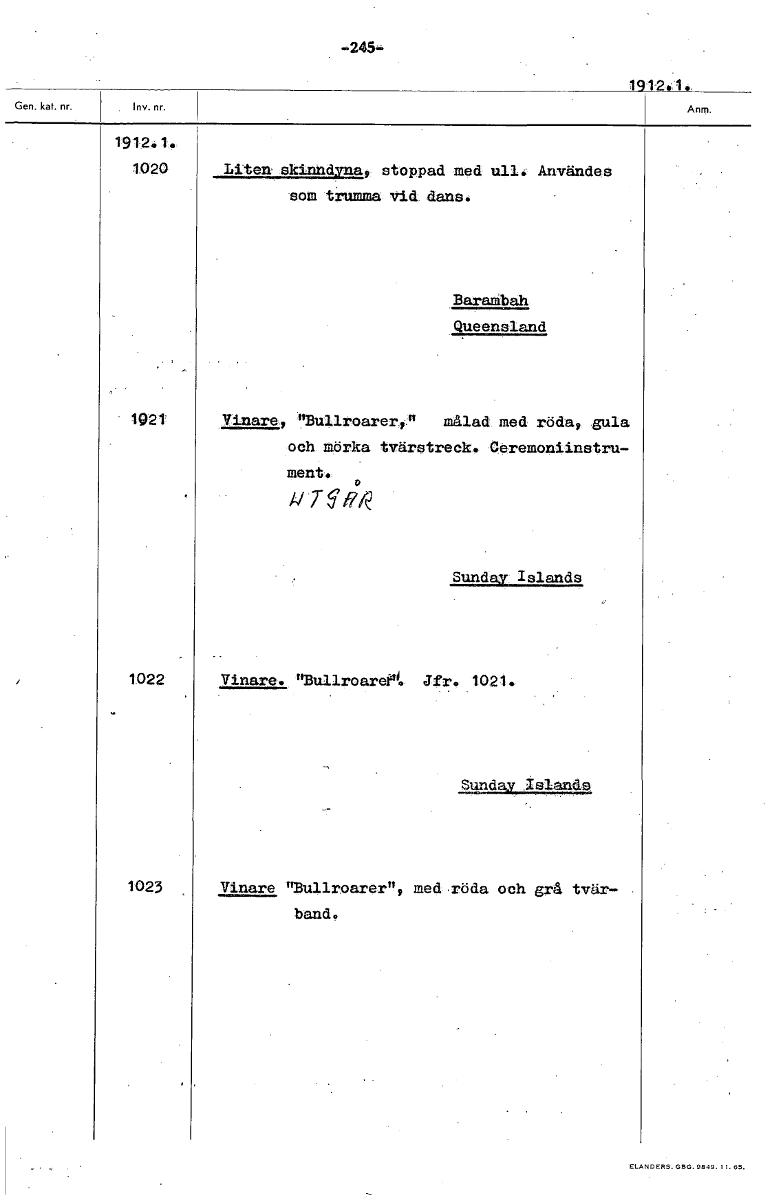 -,245• 1912.1. 1912.1. 1020 Liten skinndyna, stoppad med ull. Användes som trumma vid dans. Barambah Queensland 1021 Vinare, "Bullroarer,." målad med röda, gula och mörka tvärstreck* Oeremoniinstru- m...