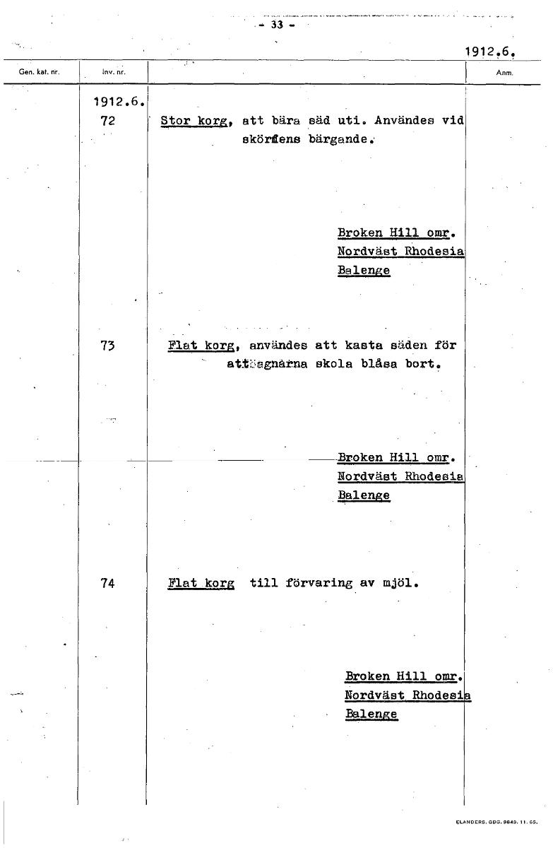 • - 33 - 1912.6. 1912.6. 72 Stor korg, att bära säd uti, Användes vid skördens bärgande. Broken Hill omr. Nordväst Rhodesia Balenge 73 Flat korg, användes att kasta säden för attUaghårna skola blåsa bor... Visa hela