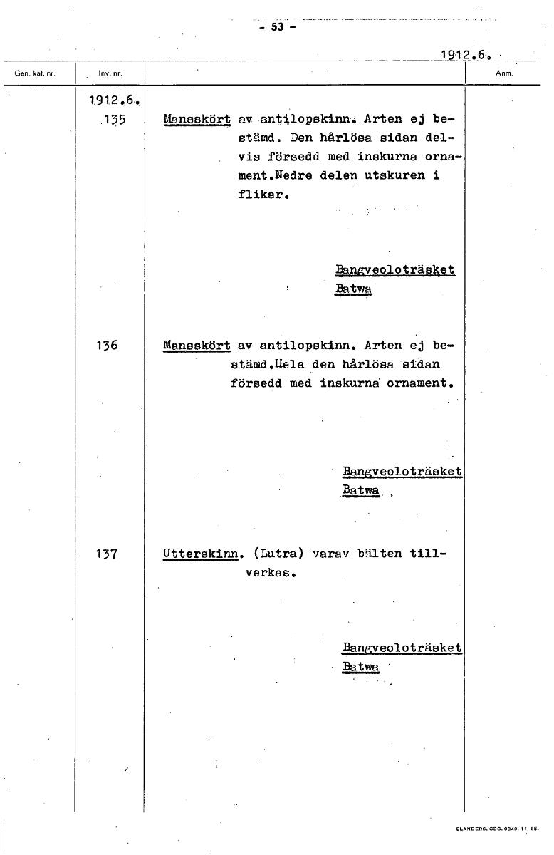 • - 53 - 1912.6. 1912,•., 155 Mansskört av antilopskinn. Arten ej be- stämd. Den hårlösa sidan del- vis försedd med inskurna orna- ment.Nedre delen utskuren i flikar. Bangveoloträsket Batwa 136 Mansekör... Visa hela