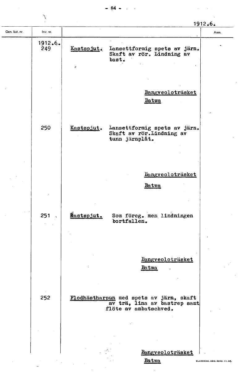 • - 84 - 1912.6. 1912.6,. 249 Kastspjut: Lansettformig spets av järn. Skaft av rör. Lindning av bast. Bangveoloträsket Batwa 250 Kastspjut. Lansettformig spets av järn. Skaft av rör.Lindning av tunn jär... Visa hela
