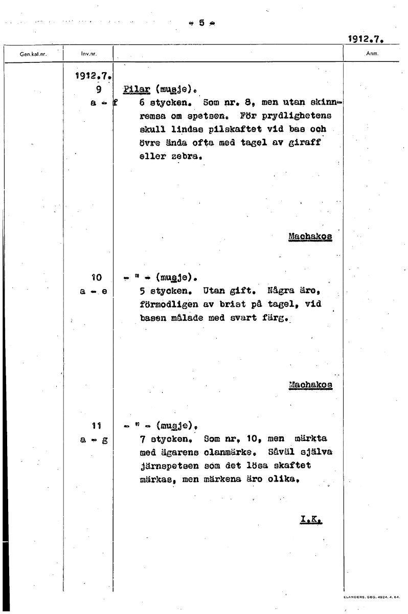 • 5 ¥. 1912.7, 1912.7. 9 Fllar (mmgje). 6 stycken. Som nr. 80 men utan skinn,- remsa om spetsen. För prydlighetens skull lindas pilskaftet vid bas och övre ända ofta med tagel av giraff eller zebra, Mao... Visa hela
