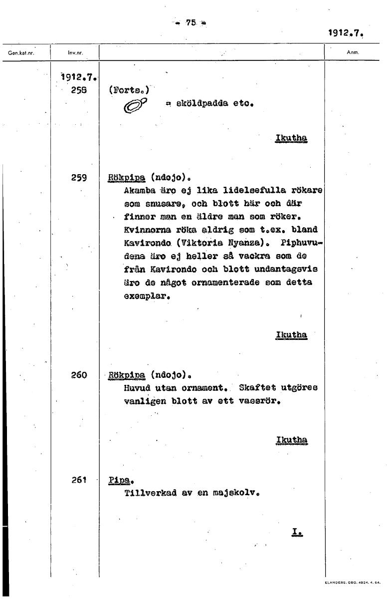« 75 4, 1912.7. 1912.7. 256 (Port%) n. sköldpadda etc. Ikutha 259 ~Ra (ndojo), Akamba 'äro ej lika lidelsefulla rökare som snusare, och blott här och där finner man en äldre man som röker. Kvinnorna röka aldrig som t.ex. bland Kavirondo (Vikteria Nyanza). Piphuvu. dena äro ej heller så vackra som de från Kavirondo och blott undantagsvis äro de något ornamenterade som detta exemplar. Ikutha 260 Rökpipa (ndojo). Huvud utan ornament.. Skaftet utgöres vanligen blott av ett vaesrör. Ikutha 261 • 11-2ä, Tillverkad av en majskolv, [ocr]Stäng