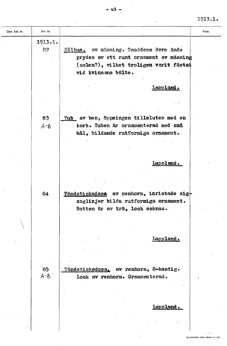 1913.1, 1513.1. 82 Nålhun.1 av mrissing. Snoddens övre ände prydes av ett runt ornament av mässi (solen?), vilket troligen varit fästa vid kvinnane bälte. Lappland._ 83 Tub av ben, öppningen.tillslute...