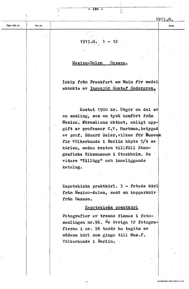 1913.8. 1915.8. - 12 Mexico Dalen Oaxaca. Inköp från Frankfurt am Main för medel skänkta av Ingenjör Gustaf Cedergren.. Kostat 1500 kr. Utgör en del av en samling, som en tysk hemfört från Mexico. Föremålens äkthet, enligt upp- gift av professor C.V. Hartmanebetygad ev prof. Eduard Seler,vilken för buse ftir Völkerkunde i Berlin köpte 5/4 av kärlen, medan resten tillföll Etno- grafiska Riksmuseum i Stockholm. Se vidare "Tillägg" och inneliggande katalog. Zapotekiska praktkärl. 3 - fotade kärl från Mexico-dalen, samt en kopparkniv från Oaxaca. Zapotekiska praktkärl Fotografier av trenne finnas i foto-. samlingen nr.96. De övriga 12 fotogra fierna i nr, 96 torde ha tagits av sådana kärl som gingo till Mus.f. Völkerkunde i Berlin. [ocr]Stäng