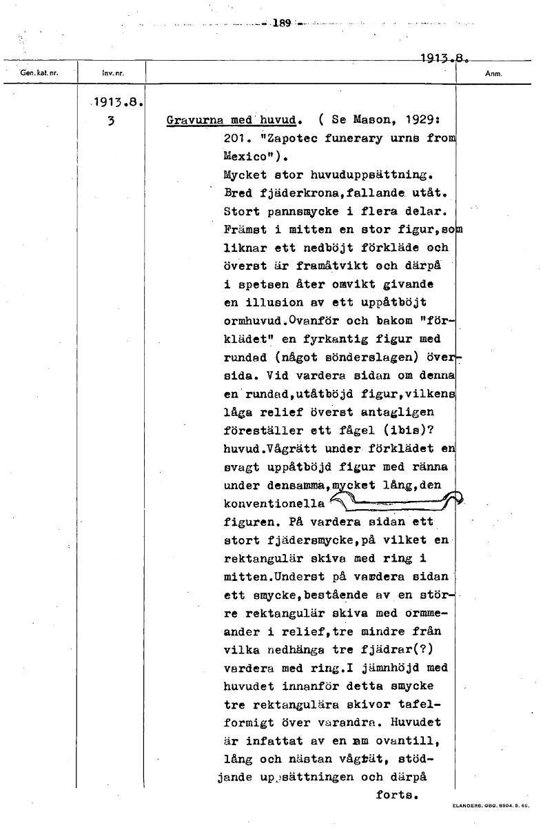 1913.8 1913.8. 3 Gravurna med huvud. ( Se Mason, 1929: 201. "Zapotec funerary urna fro Mexico"). Mycket stor huvuduppsättning. Bred fjäderkrona,fallande. utåt. Stort pannsmycke i flera delar. Främst i mitten en stor figur,so liknar ett nedböjt förkläde och överst är framåtvikt och därpå i spetsen åter omvikt givande en illusion av ett uppåtböjt ormhuvud.Ovanför och bakom "för- klädet" en fyrkantig figur med rundad (något sönderslagen) över sida. Vid vardera sidan om denna en rundad,utåtböjd figurevilkens låga relief överst antagligen föreställer ett fågel (ibis)? huvud.Vågrätt under förklädet e svagt uppåtböjd figur med ränna under densamma,m eket lång,den konventionella figuren. På vardera sidan ett stort fjcidersmyckeppå vilket en rektangulär skiva med ring i mitten.Underst på vardera sidan ett smycketbestående av en stör- re rektangulär skiva med ormme- ander i relief,tre mindre från vilka nedhänga tre fjädrar(?) vardera med ring.I jämnhöjd med huvudet innanför detta smycke tre rektangulära skivor tafel- formigt över varandra. Huvudet är infattat av en am ovantill, lång och nästan vågrät, stöd- jande upisättningen och därpå forts. [ocr]