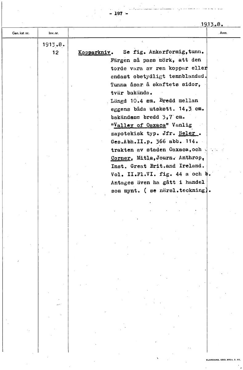• - 197 - 191108. . 191308. 12 Kopparkniv. Se fig. Ankarformig, tunn. Färgen så pass mörk, att den torde vara av ren koppar eller endast obetydligt tennblandad. Tunna åsar å skaftets sidor, tvär bakända... Visa hela