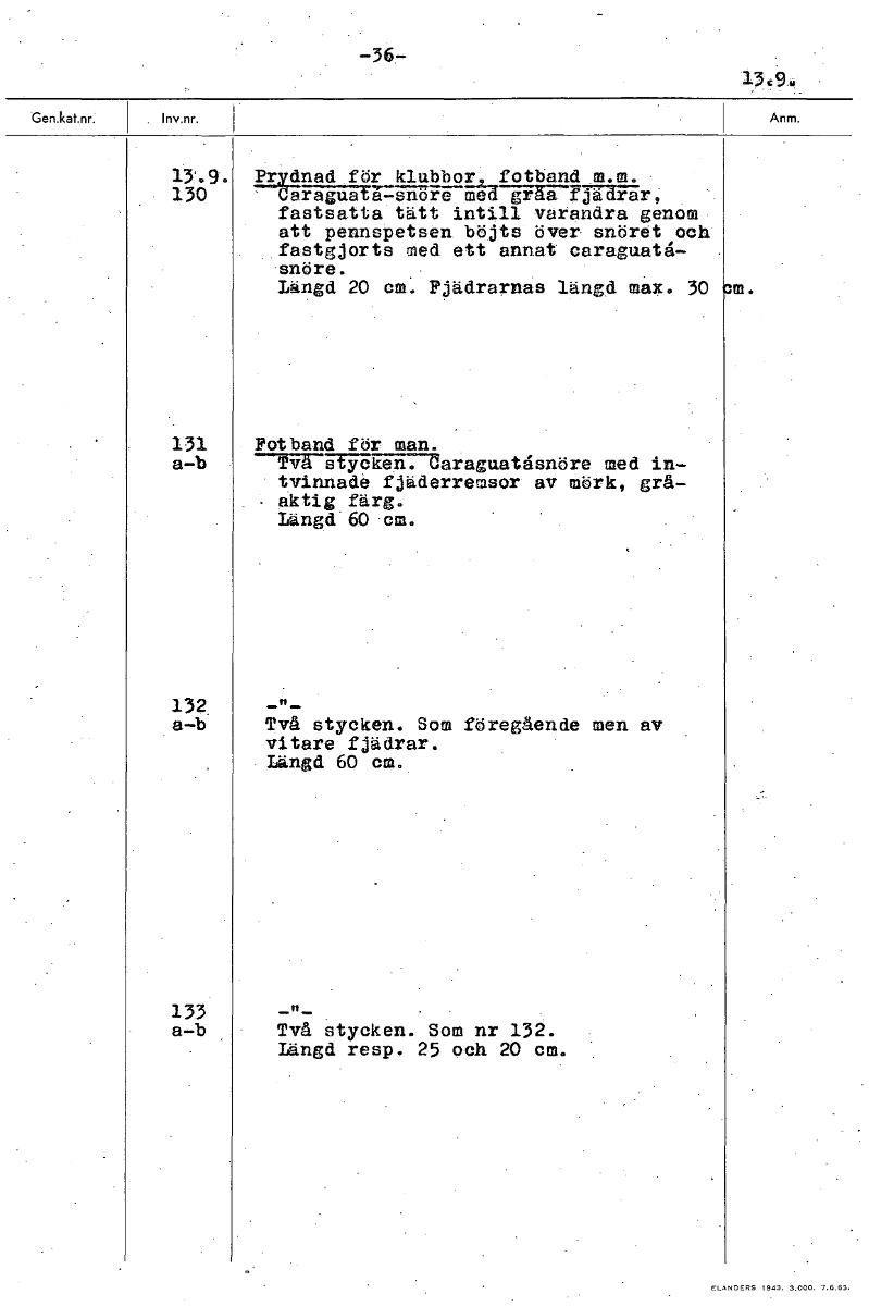 -36- 13.9„ Ifyllnad för klubbor fotband m.m. 130 eåraguatPUHUrå-ma -ffiTä-nrEHr, fastsatta tätt intill varandra genom att pennspetsen böjts över snöret och fastgjorts med ett annat caraguatå- snöre. Längd 20 cm. Fjädrarnas längd max. 30 131 Fotband för man. ab 571UfFekenTUaraguatganöre med in- tvinnade fjäderremsor av mörk, grå- . aktig färg. Längd 60 cm. 132, -"- a-b Två stycken. Som föregående men av vitare fjädrar. Längd 60 cm. 133 -"- a-b Två stycken. Som nr 132. Längd resp. 25 och 20 cm. [ocr]Stäng