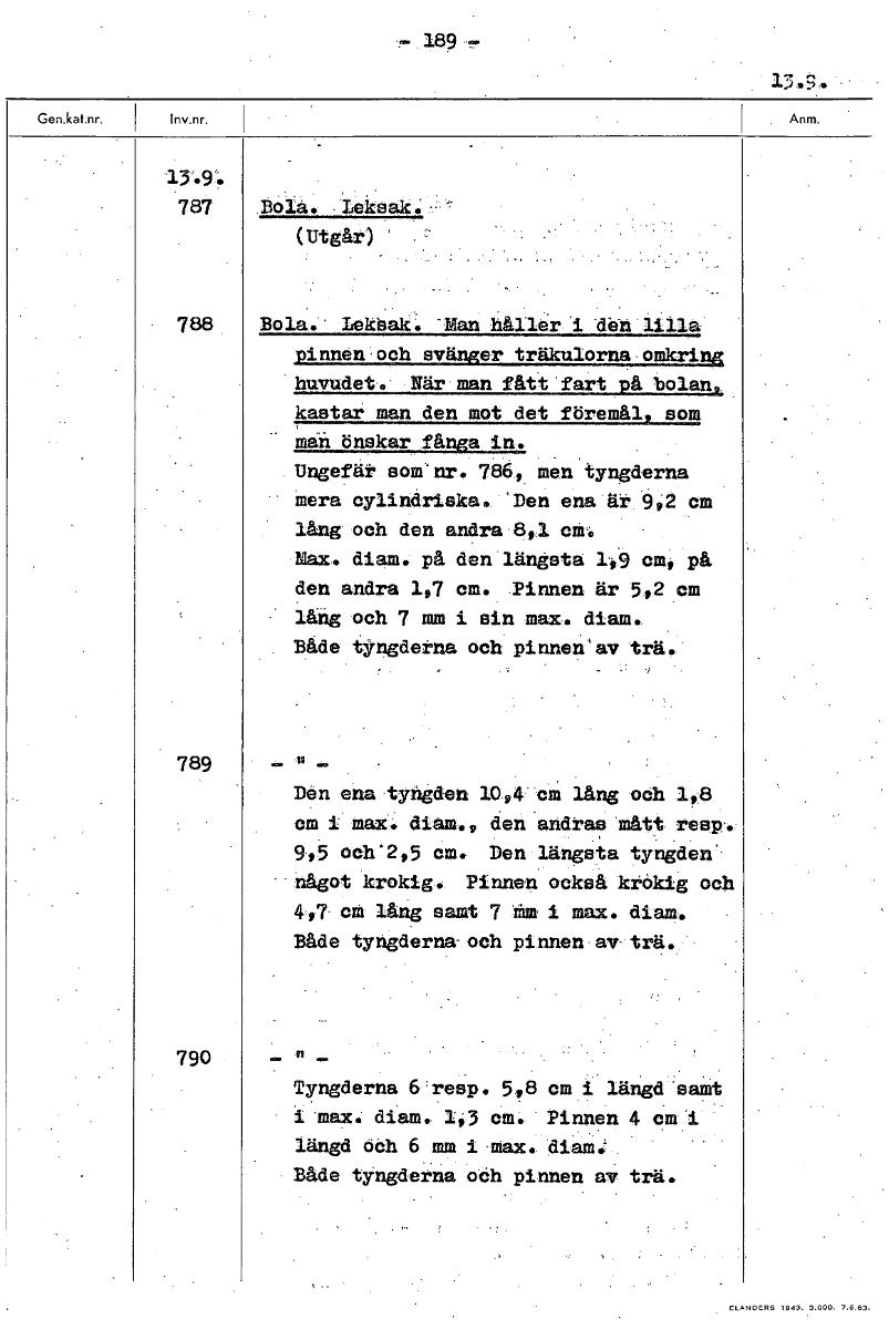 13 . 9 . 787 Bola. leksak. (utgår) 788 Bola. ' Leksak. "Man hållör. I dön lilla pinnen-och svänger träkulorna omkring huvudet. När man fått fartpå bolan. kastar man den mot det föremål, som man önskar...