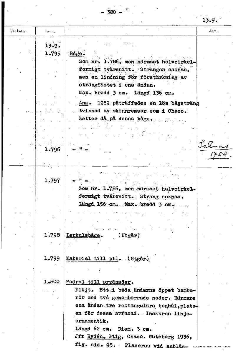 - 3.80 13.9. - 1.795 • BåRe.' Som nr. 1.786, men. närmast halvcirkel- formigt tvärsnitt. Strängen saknas, men en lindning för förstärkning av strängfästet i enaändan. Max. bredd 3 cm. Längd 136 cm. • . Anm. 1959 påträffades bågsträ• en lös tvinnad av skinnremsor som i Chaco. • Sattes då ,på denna bage. 1.796 1.797 • Som nr. 1.786r men närmast halvcirkel- formigt tvärsnitt. Sträng saknas. Längd,, 156 cm. Max. bredd 3-cm. 1.798 Lerkulsbåge. (Utgår) 1.799 Material till pil. Utgår), 1.800 Fodral till Drydnader. Plöjt. :Ett.:1 bada ändarna öppet bambu- rör med tv a genomborrade noder. Närmare ena ändan tro rektangulära tonhål,plat en för dessa avfasad.. Inskuren- linje- ornamentik. Längd 62 cm. Diam. 3 cm. Jfr Rydén, Stig, Chaco. Göteborg 1936, fig.. sid. 95. Placeras vid anblås- [ocr]