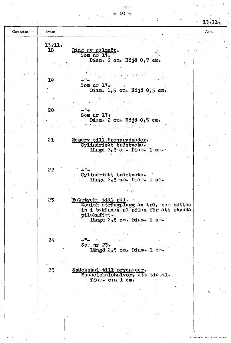 — 10 13./1. 18 Som nr 17. Diam. 2 em Höjd 0,7 cm. 19 Som nr 17. • -.. Diam. 1,5 cm. Höjd 0,5 cm. 20 Som nr 17. Diam. 2 cm., Höjd 095 cm. 21 Reserv till öronprydnader. Cylindriskt trästycke. Längd 2,5 ...