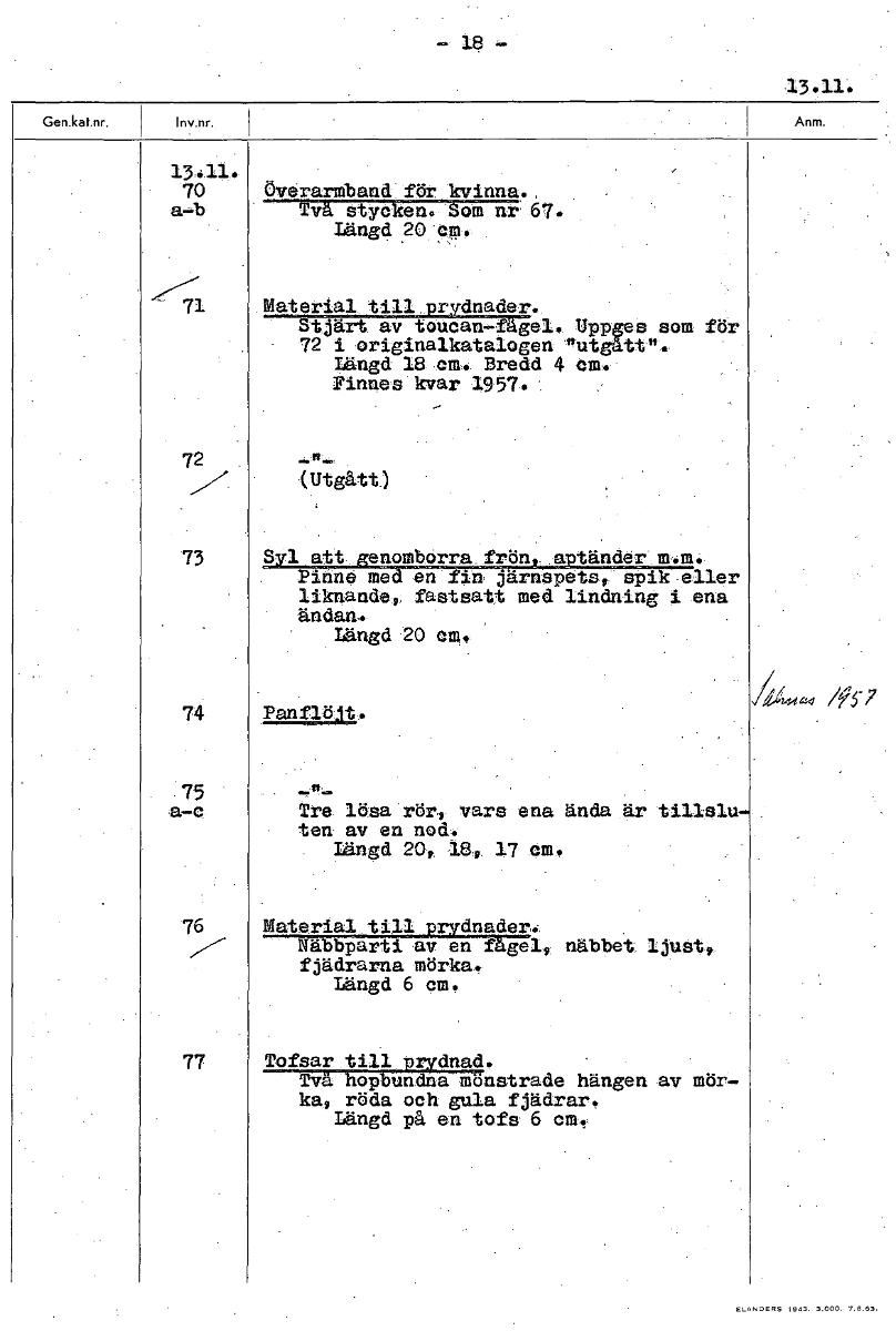 18 13.11. 70 Överarmband för kvinna., a-b Två stycken. Som nr 67. Längd 20 cm. 71 Material till prydnader. • Stjärt av toucan-fägel. Uppges som för • 72 i originalkatalogen "utgått". Längd 18 cm. Bredd 4 cm. Finnes kvar 1957. 72 (Utgått.) 73 Syl att genomborra frön, aptänder Pinne med en fin järnspets spik eller liknandep, fastsatt med lindning i ena ändan. Längd 20 cm. a44 /957 74 Panflött. • 75 a-c Tre lösa rör, vars ena ända är tilisluten av en nod. Längd 20, 18, 17 cm. 76 Material till prydnader.. Näbbparti av en fågel, näbbet ljust, fjädrarna mörka. Längd 6 cm. 77 Tofsar till prydnad. Två hopbundna mönstrade hängen av mör- ka, röda och gula fjädrar. Längd på en tofs 6 cm. [ocr]