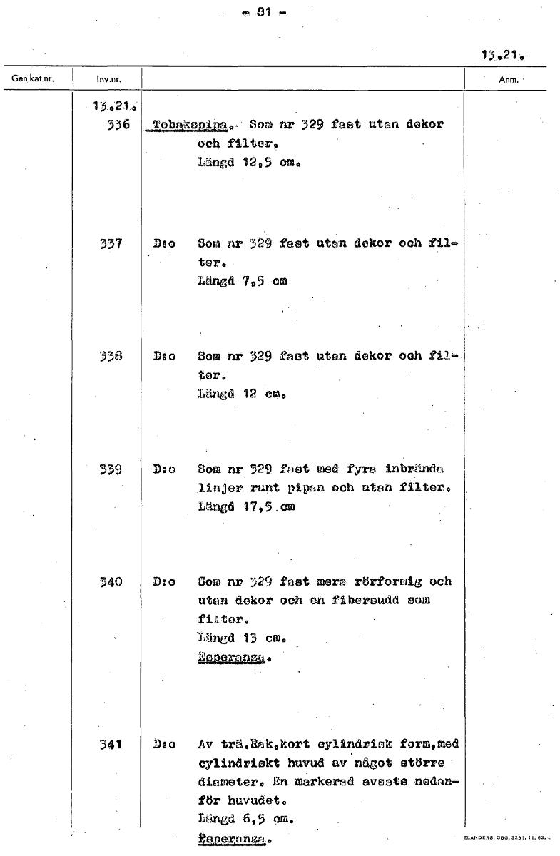 -81 13.21.. 13 821 336 Tobakspips.0. Som nr 329 fast utan dekor och filter, Längd 1295 om, 337 Deo Som nr 329 fast u on dekor och fil- ter. Längd 71,5 cm 338 D:o Som nr 329 fast utan dekor och fil- ter. Längd 12 cm, 339 D:o Som nr 329 fast med fyra inbrända linjer runt pipan och utan filter, Längd 1795.cm 340 D:o Som nr 329 fast mera rörformig och utan dekor och en fibersudd som fikter. längd 13 cm. Esperanza, 341 D:o Av trä.Rabkort cylindrisk form,med cylindriskt huvud av not större. diameter, En markerad avsats nedan- för huvudet, Längd 695 em, Capers:lan. [ocr]