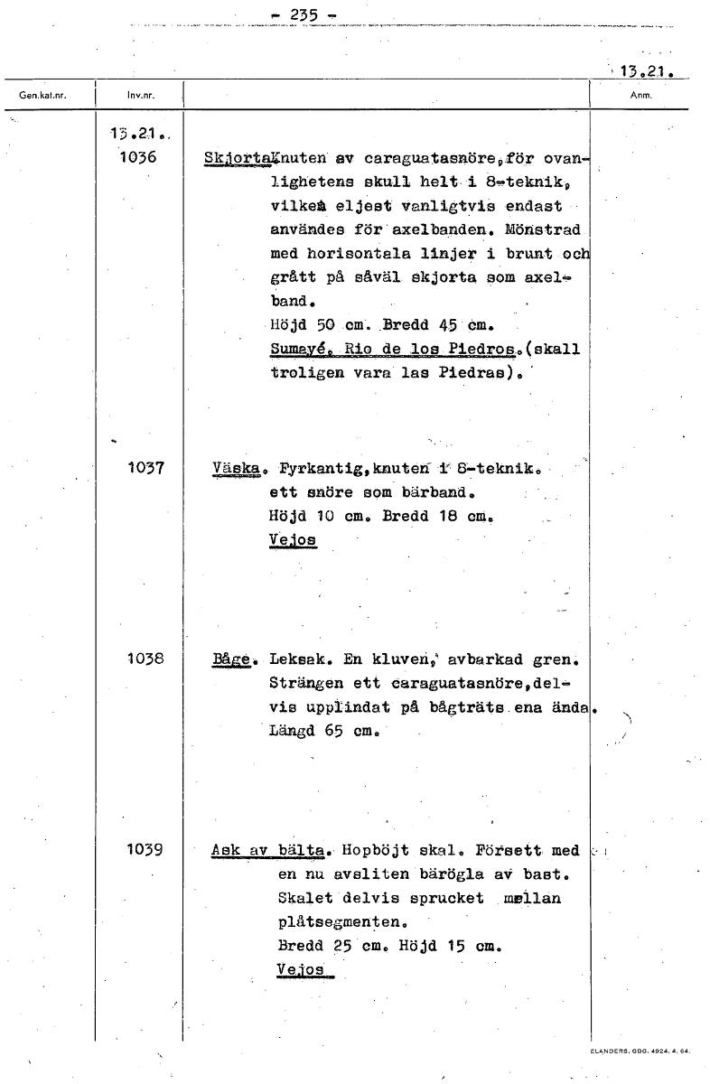 , 235 , 13,21. 13.21, 1036 Wortg.nuten av caraguatasnörepOr ovan lighttene skull helt -i 8,teknik9 vilket eljest vanligtvis endast användes för axelbanden. Mönstrad med horisontala linjer i brunt och grått på såväl skjorta som axel band. Höjd 50 cm. Bredd 45 Cm. Sarney& Rio de los Piedros.(skall troligen vara las Piedras)0. 1037 Väska. Pyrkantig,knuten" i- 8-teknik. ett snöre som bärband. Höjd 10 cm, Bredd 18 cm. Vejos 1038 Båge:. Leksak. En kluven; avbarkad gren. Strängen ett daraguatasnöre,del, vis upplindat på bågträts ena ända • Längd 65 cm. 1039 Ask av bälta. Hopböjt skal. Pötsett med en nu avsliten bärögla aV bast. Skalet delvis sprucket raglan plåtsegmenten. Bredd 25 cm. Höjd 15 cm. Vejos [ocr]
