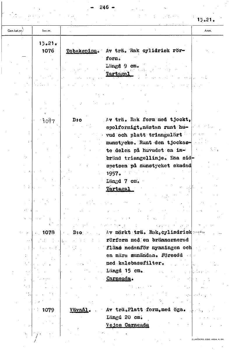 246-, 3 o2 1 13.21, 1076 Tobakepipao Av trä ,'Rak oylldriek rör- form, längd 9 cm, TaFtaga.A 3617 D:o Av trä, Rak form med tjocktp spolformigtonästan runt hu- , vud och platt tria401,lärt • munstycke. Runt,defl tjockas- te delen på huvudet en in- bränd triangellinje, Ene eld • spetsen på Munstycket ekadad 1957. • Längd 7 ciao 'kart al , 1078 Dao • 4v mörkt : trä 0 • .&köylindr10 rörform reden brännornered ' nänä nedanför mynningen oc en nära mu den.. Försedd med,kalebassfiltero Längd 15 cm.. .Carn‘dato 1 Vävnål. • Av trä,Platt,formemed öga. Längd 20 cm. Vepa Oarneada [ocr]