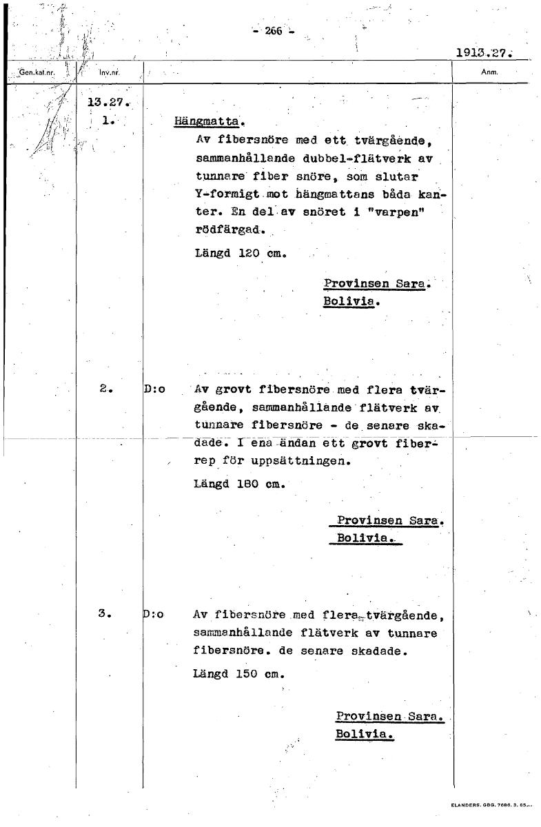 266 '1. 1913.27: 13.2? . ■ 1. Hängmatta. Av fibersnöre med ett, tvärgåandej sammanhållande dubbel-flätverk av , tunnare* fiber snörew som slutar Y.,formigt.mot hängmattans båda. kan- ter.. En del. av ...