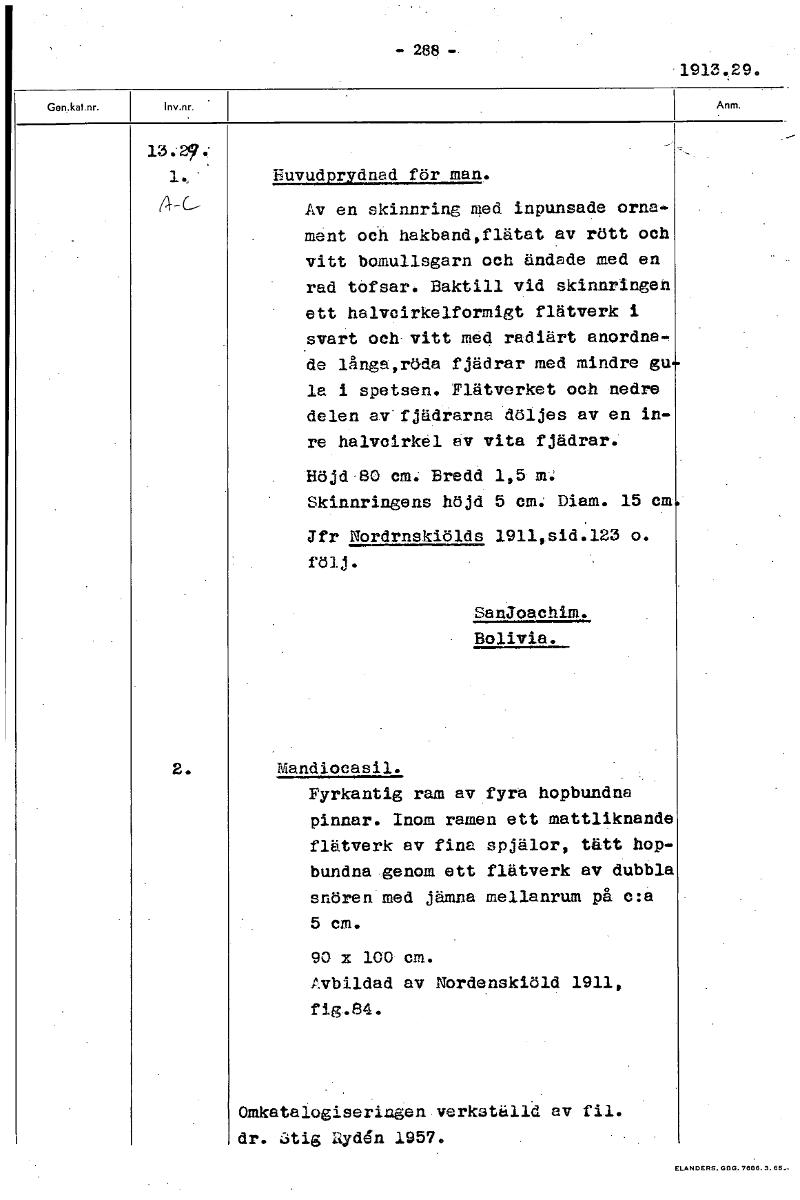 - 288 - .1913.29. Huvudprydnad för man. Av en skinnring med inpunsade orna.ment och hakband, flätat av rött och vitt bomullsgarn och ändade med en rad tofsar. Baktill vid skinnringen ett halvcirkelformigt flätverk i svart och vitt med radiärt anordnade 1ånga, röda fjädrar med mindre gula i spetsen. Flätverket och nedre delen av fjädrarna döljes av en inre halvcirkel av vita fjädrar. Böjd 80 cm. Bredd 1,5 m. Skinnringens höjd 5 cm. Diam. 15 cm Jfr Nordrnskiölds 1911„sid.123 o. följ. San Joachim. Bolivia. 2. Mandiocasil. Fyrkantig ram av fyra hopbundna pinnar. Inom ramen ett mattliknande flätverk av fina spjälor, tätt hop- bundna genom ett flätverk av dubbla snören med jämna mellanrum på c:a 5 cm. 90 x 100 cm. Avbildad av Nordenskiöld 1911, fig.84. Omkatalogiseringen verkställd av fil. dr. Stig Rydgn 1957. [ocr]