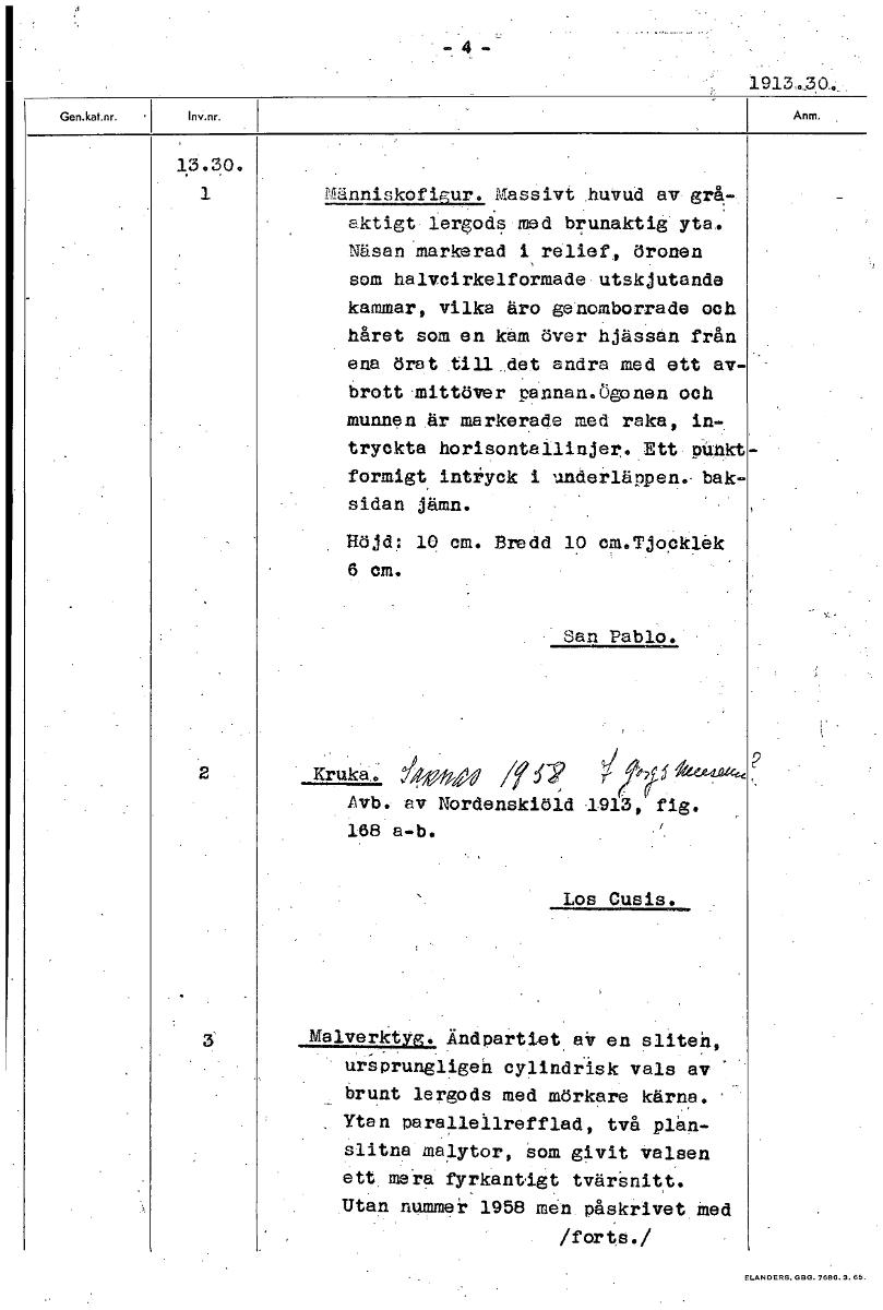 - 4 - 1913.30 1 Människofigur. Massivt huvud av gråaktigt lergods med brunaktig yta. Näsan markerad i relief, öronen som halvcirkelformade utskjutande kammar, vilka äro genomborrade och håret som en kam över hjässan från ena örat till det andra med ett avbrott mitt över pannan. Ögonen och munnen är markerade med raka, intryckta horisontallinjer. Ett punkt formigt intryck i underläppen. Baksidan jämn. Höjd: 10 cm. Bredd 10 cm.Tjocklak 6 cm. San Pablo. 2 Kruka. Saknas 1958, i Gbg:s museum? Avb. av Nordenskiöld 1913, fig. 168 a-b. Los Cusis. 3 Malverktyg. Ändpartiet av en sliten, ursprungligen cylindrisk vals av brunt lergods med mörkare kärna. Ytan parallellrefflad, två planslitna malytor, som givit valsen ett mera fyrkantigt tvärsnitt. Utan nummer 1958 men påskrivet med /forts./ [ocr]