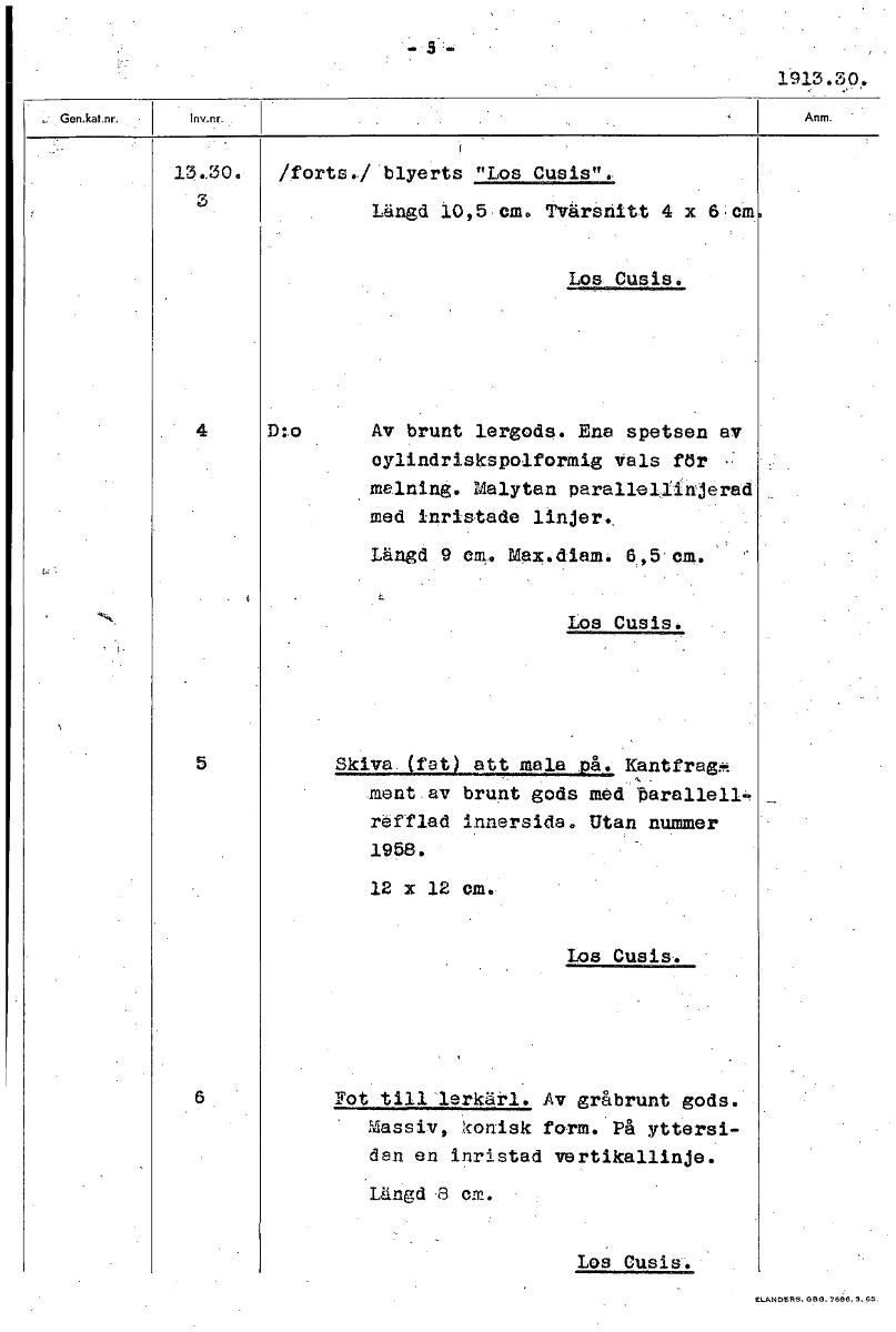 1913.30. /forts./ blyerts "Los Cusis". Längd 10,5.cm. Tvärsnitt 4 x 6 cm Los Cusis. 4 Malverktyg. Av brunt lergods. Ena spetsen av cylindrisk spolformig vals för malning. Malytan parallellinjerad med inristade linjer. Längd 9 cm. Max.diam. 6,5 cm. Los Cusis. 5 Skiva (fat) att mala på. Kantfragment av brunt gods med parallellrefflad innersida. Utan nummer 1958. 12 x 12 cm. Los Cusis. 6 Fot till lerkärl. Av gråbrunt gods. Massiv, konisk form. På yttersidan en inristad vertikallinje. Längd 8 cm. Los Cusis. [ocr]